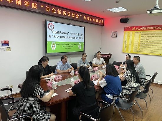 2022年8月15日,学前学院肖英娥副院长、实践教研室主任王先达教授、学生科科长李猷艺老师一行前往晋江市教师进修学校、心怡幼儿园等单位开展"访企拓岗促就业"专项行动座谈会暨"深化产教融合、服务学前教育"调研会。晋江市教师进修学校肖丽婷副书记等领导、晋江市心怡幼儿园庄清全董事长以及我院部分毕业生代表共同参与本次调研会。
