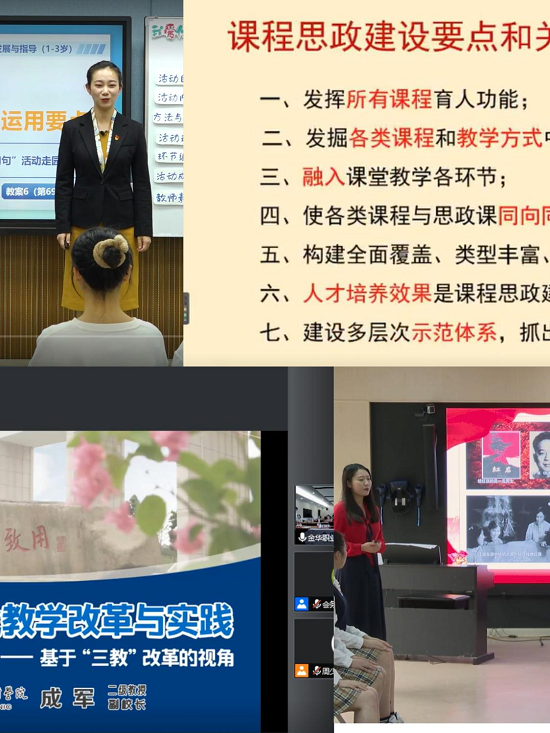 随后,上海高等教育督导评价专家委员会委员张智强教授与金华职业技术学院副校长成军教授分别做了《高校课程思政建设与实施路径》《新时期模块化教学改革与设计》的专题发言。接着,杭州市人民职校、徐州幼儿师范高等专科学校、杭州师范大学与金华职业技术学院的教学团队分别带来教育部课程思政示范课程《声乐》《学前教育学》、省级课程思政示范课程《学前儿童语言教育》《婴幼儿言语发展与指导》的案例分享及现场片段展示,介绍了课程思政建设的总体设计、课程思政特色与创新以及取得的成果经验等方面内容。