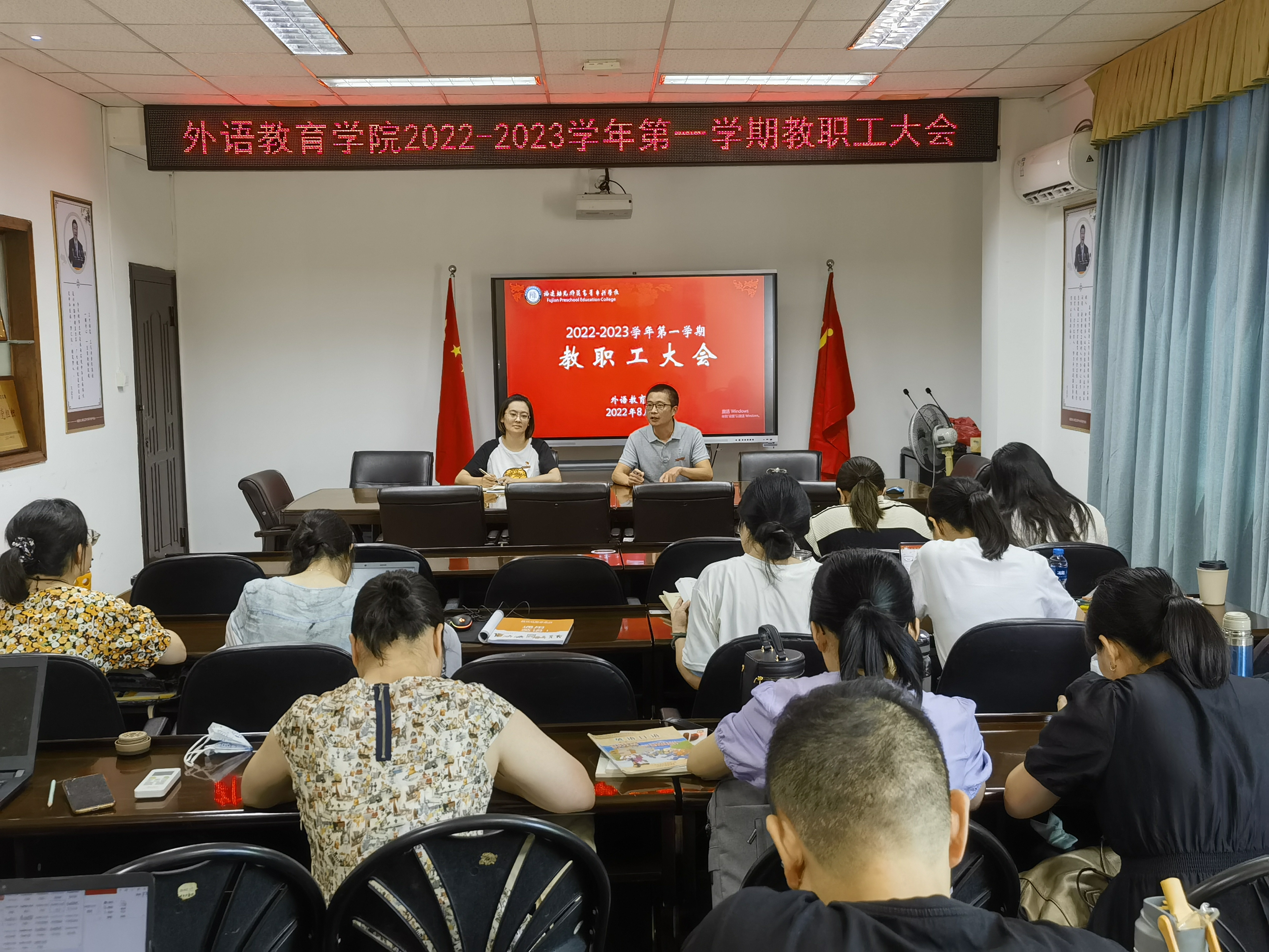 2022年8月31日上午,外语教育学院在201会议室召开2022-2023学年第一学期期初工作会议。学院全体教师参会,会议由叶一青副院长主持。