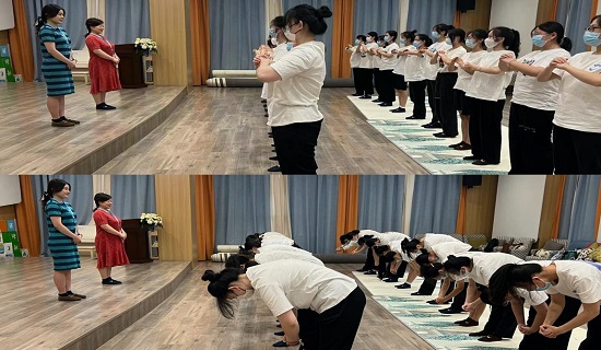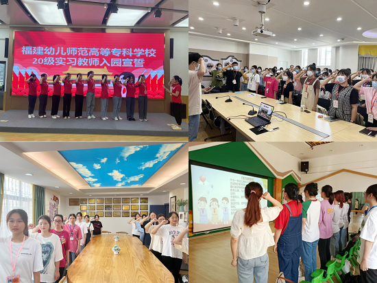 各基地园所对我院实习生的到来纷纷表示热烈欢迎,并精心准备,均为实习生召开了隆重的"见面会"。"见面会"上,各园所领导以丰富多彩的形式为实习生做了细致而全面的园所介绍及实习任务讲解,有效帮助实习生快速了解并融入园所的教育实习生活。为彰显立德树人的育人理念,强化师德师风教育,我院敏锐捕捉教育契机,以"见面会"作为载体,在"见面会"中创新引入"拜师"、"宣誓"等环节,将师德师风教育有机融入实践之中。通过实习生向基地园所指导教师"拜师",以表尊师重道的优良美德;通过我院带队教师领誓,实习生宣誓,在加强实习生实习仪式的同时,表明实习生恪守教师职业道德与励志成为一名优秀幼儿教师的决心。会后,我院带队教师与基地指导教师共同带领实习生进班,实习生积极与班级幼儿交流互动,主动融入班集体,快速实现自身从学生向一名实习教师的的角色转化。同时,带队教师与基地指导教师同心协力,以幼儿班级为单位,为实习生入园困惑提供指导。