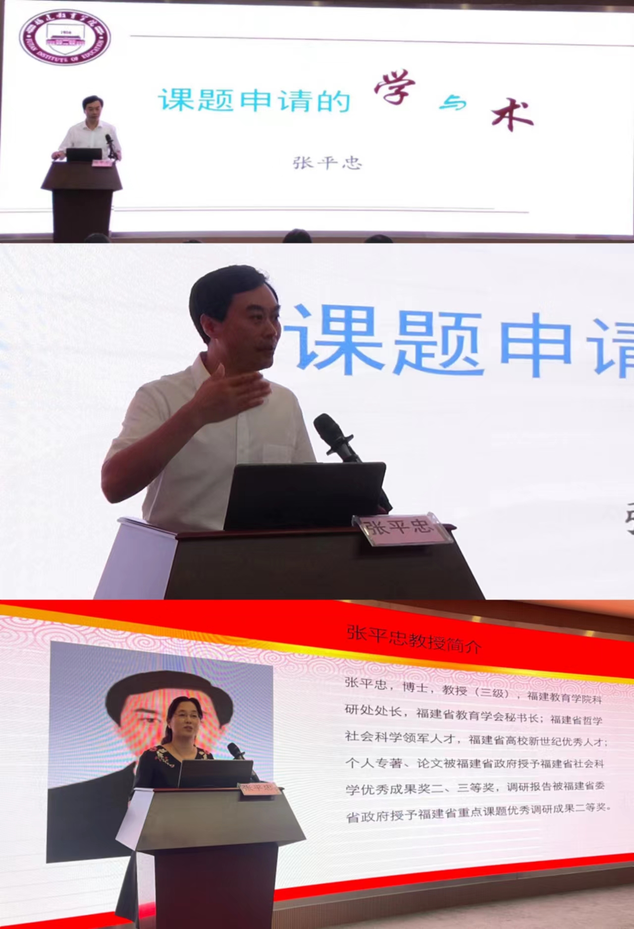 张平忠教授从正确认识教学与科研的关系入手,强调科研意识的重要性,逐一对课题来源渠道、课题评议标准、课题酝酿选题、课题申请书作文等方面进行指导,并详细介绍了课题申请是否成功的重要影响因素。张教授还结合福建省社科课题申报书的撰写,与现场教师们充分交流研讨,并对我院教师的福建省中青年教师教育科研项目基础教育研究专项进行实例分析与点评,对教师申报课题的拟题及论证过程中的规范性和学术性进行细致剖析与改进。