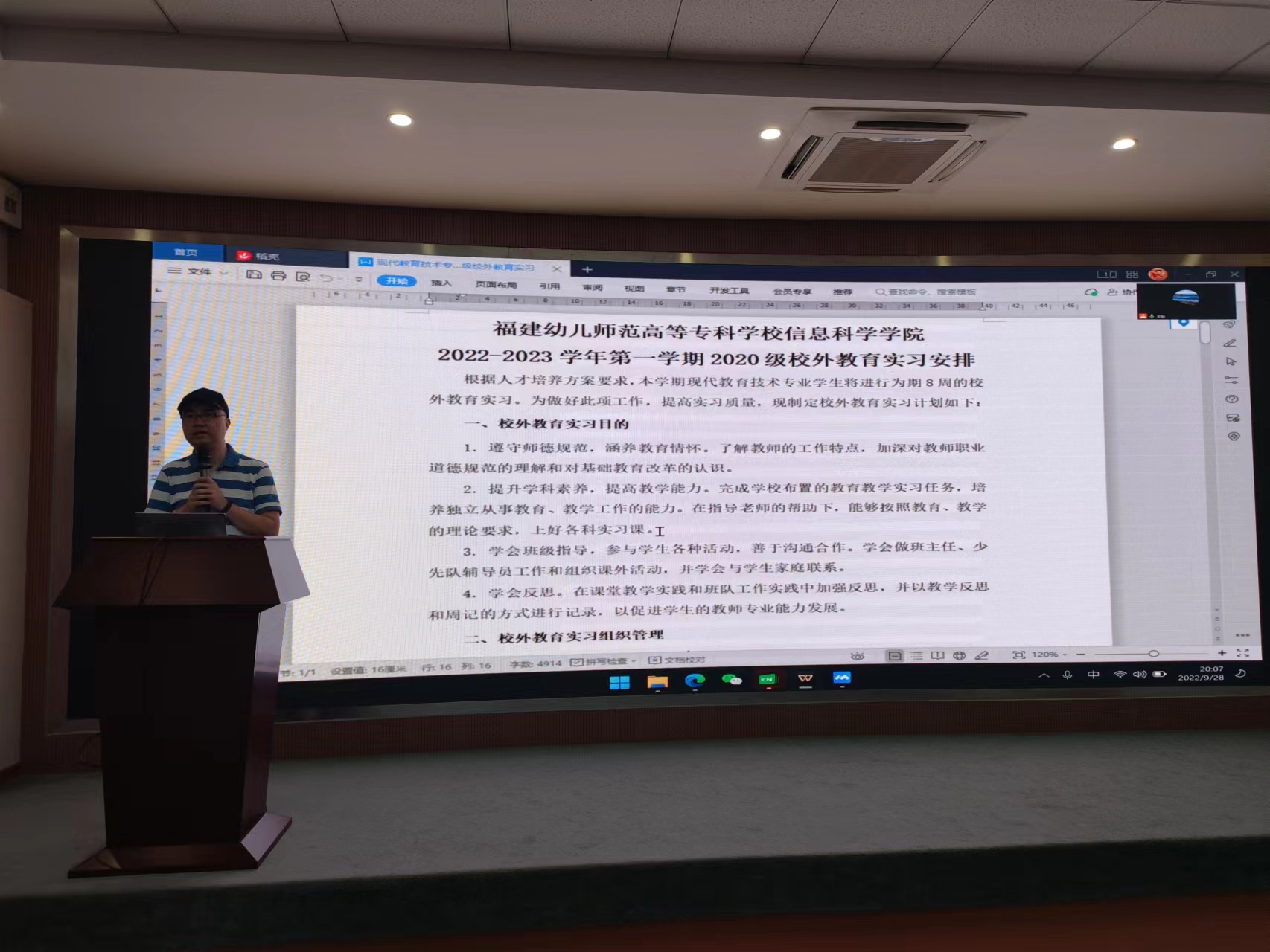 讲座结束后,实践教研室开展了现教专业20和21级教育见实习动员会,会议由实践教研室主任卓皓老师主持,卓老师转达了学院陈宁华院长对于本次教育见实习的要求,他强调同学们首先要遵守我校和实习校的各项规章制度,注意保护自身人身财产安全,注意做好疫情期间的个人防护,踏踏实实、认认真真、不折不扣地完成见实习的各项任务,争取给实习校留下良好的印象。然后,陈怀宇老师对见实习的计划、具体内容要求均做了详细地介绍并回答了同学们的疑问。