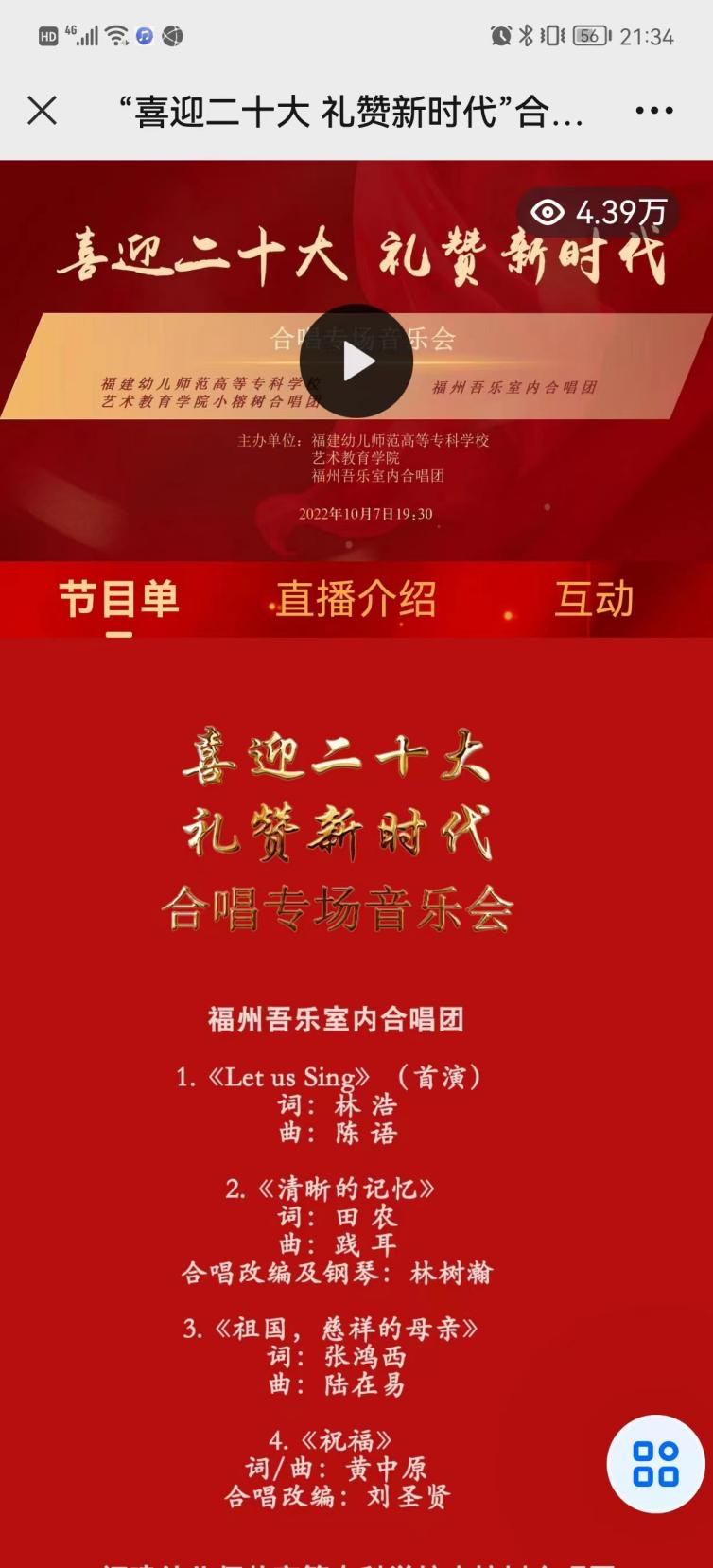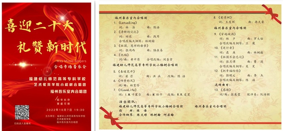音乐会伊始,艺术教育学院院长王萍萍教授致辞,介绍了活动的背景和意义。音乐会由学院小榕树合唱团和福州吾乐室内合唱团共同演绎,《清晰的记忆》《祖国,慈祥的母亲》《春暖花开》《穿越漩涡》《逆行者》《祖国不会忘记》等耳熟能详的曲目,带来一次又一次的感动与震撼,音乐会在一曲《感谢》中圆满落幕。在合唱团的美妙歌声和动人演绎中,线上线下的参与者重温岁月经典,感悟时代脉搏,用歌声感恩、颂扬、赞美伟大的祖国、伟大的党,礼赞新时代,以音乐人特有的方式喜迎党的二十大的胜利召开。