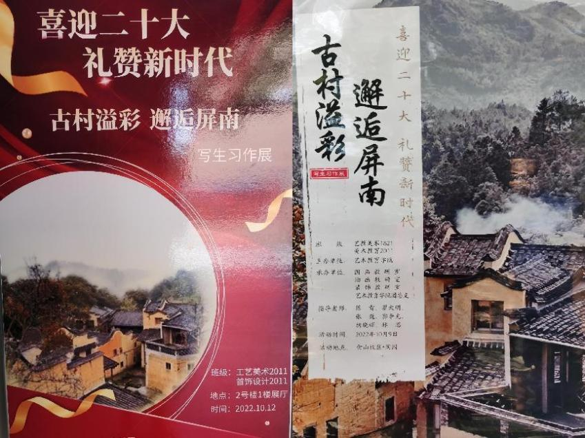 "喜迎二十大 礼赞新时代—古村溢彩 邂逅屏南"写生习作展10月9日在陶园举办。美术教育2011班、艺教美术1821屏南写生作品于陶园展出,作品类型有油画、速写、装饰画。