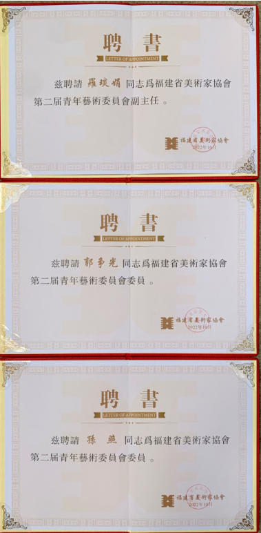 10月15日上午,福建省美术家协会青年艺委会换届大会在福州大学厦门工艺美术学院召开。会议由福建省美协秘书长赵胜利主持。会上宣布,由苏国伟任福建省美协第二届青年艺委会主任,方广智、姚莉芳、张玉惠、吴建福、陈钢、陈端、罗琰娟、刘婷任副主任。随后,福建省美协领导为新一届艺委会成员颁发聘书并举行了揭牌仪式,省文联党组成员、书记处书记、副主席、省美协主席王来文向新一届艺委会表示祝贺。我校艺术教育学院罗琰娟副教授获聘为福建省美协第二届青年艺委会副主任,郭争光老师和孙照老师获聘为委员。