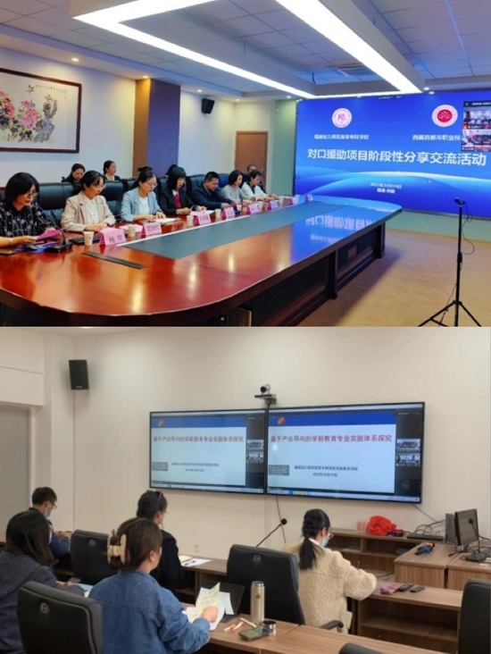 10月19日下午,由学校组织,学前教育学院承办的对口援助西藏昌都市职业技术学校项目阶段性分享交流活动以线上交流的方式,在仓山校区AR/VR工程中心会议室召开。我校学前教育学院吴丽芳院长、发展规划处陈宗宁副处长(主持工作),西藏昌都市职业技术学校教务科科长杨江涛、艺术部部长伍柯蓉等两校相关部门负责人、教研室主任、骨干教师、实训秘书等30余人参会,会议由我校发展规划处副处长杨佳主持。