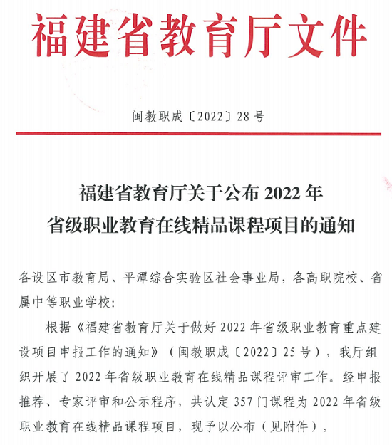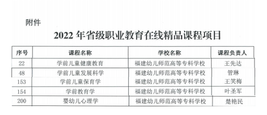 近日,省教育厅认定357门课程为2022年省级职业教育在线精品课程项目,学前教育学院5门课程上榜。其中《学前儿童健康教育》被推荐参评职业教育国家在线精品课程项目。