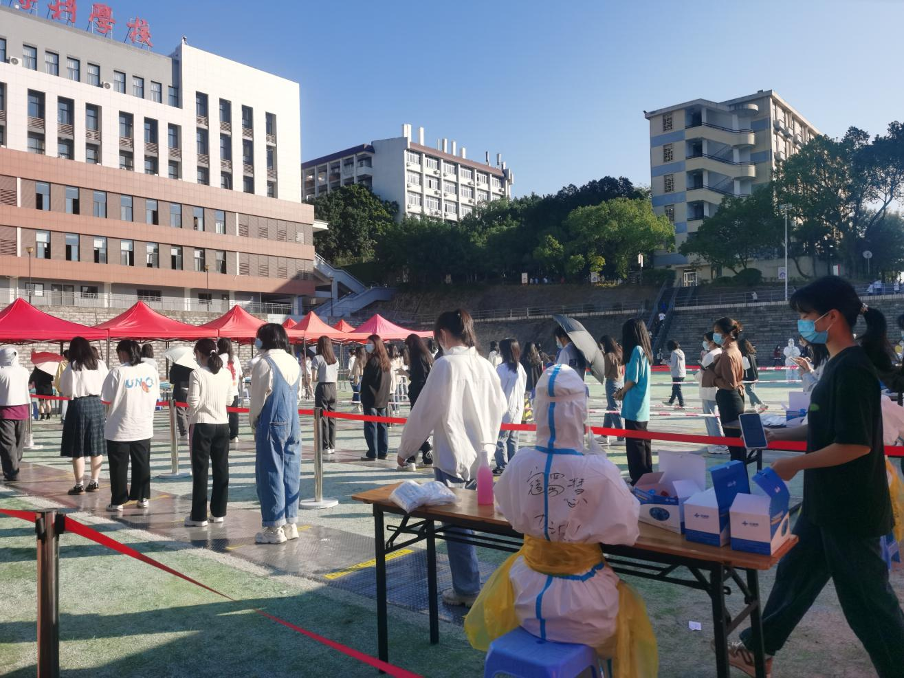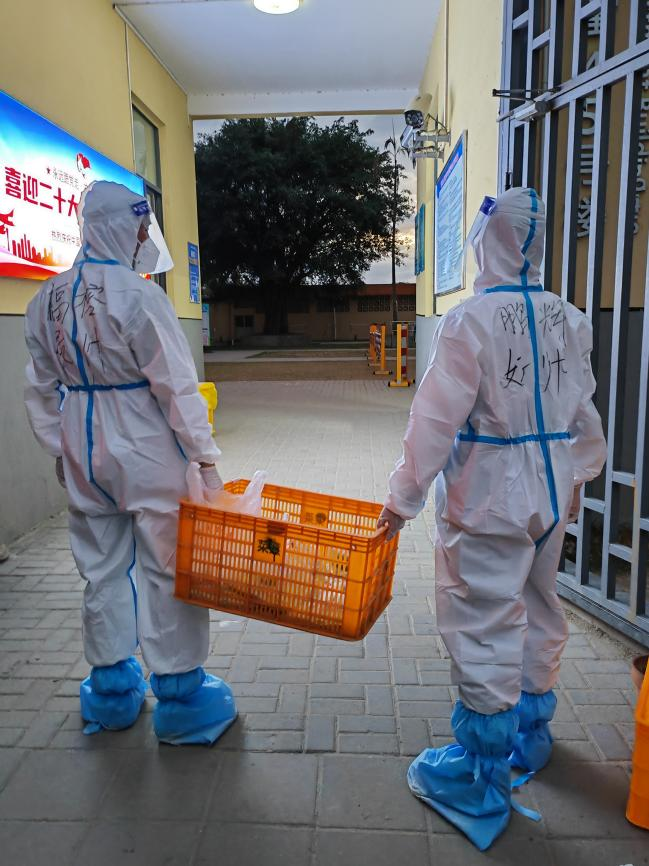 陈福榕院长还有2年就退休了,可以说是年龄最大的志愿者,接到任务就上,送餐、扫码、校门口保卫,处处都见他的身影。寇蜀慧老师体质比较弱,但始终坚持着,扫码工作一场不落,抬不动盒饭,就一间间宿舍送餐送药,尽其所能。黄鹏辉、陈辉斌两位年轻的体育老师,总是负责5、6楼的送餐,此外哪个岗位有安排,一言不发冲就是了,他们说"作为新时代青年,我们尽己所能、冲锋在前,愿为坚决打赢疫情防控阻击战、保护和谐美丽的校园贡献自己的力量。"