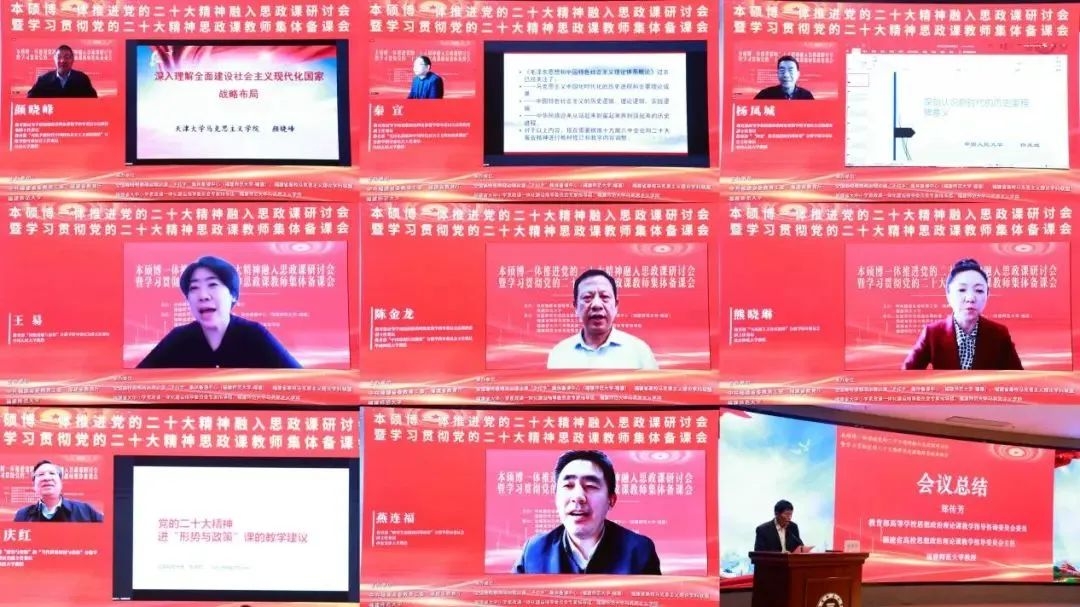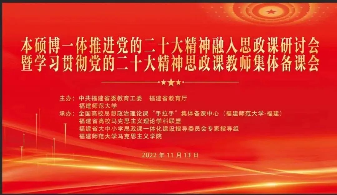 11月13日,由中共福建省委教育工委、福建省教育厅、福建师范大学主办的"本硕博一体推进党的二十大精神融入思政课研讨会暨学习贯彻党的二十大精神思政课教师集体备课会"以线上线下相结合的方式举行。此次研讨会暨集备会邀请了多位知名专家学者作主题发言,福建省大中小学思政课一体化建设指导委员会专家指导组成员、全省高校思政课教师参会。