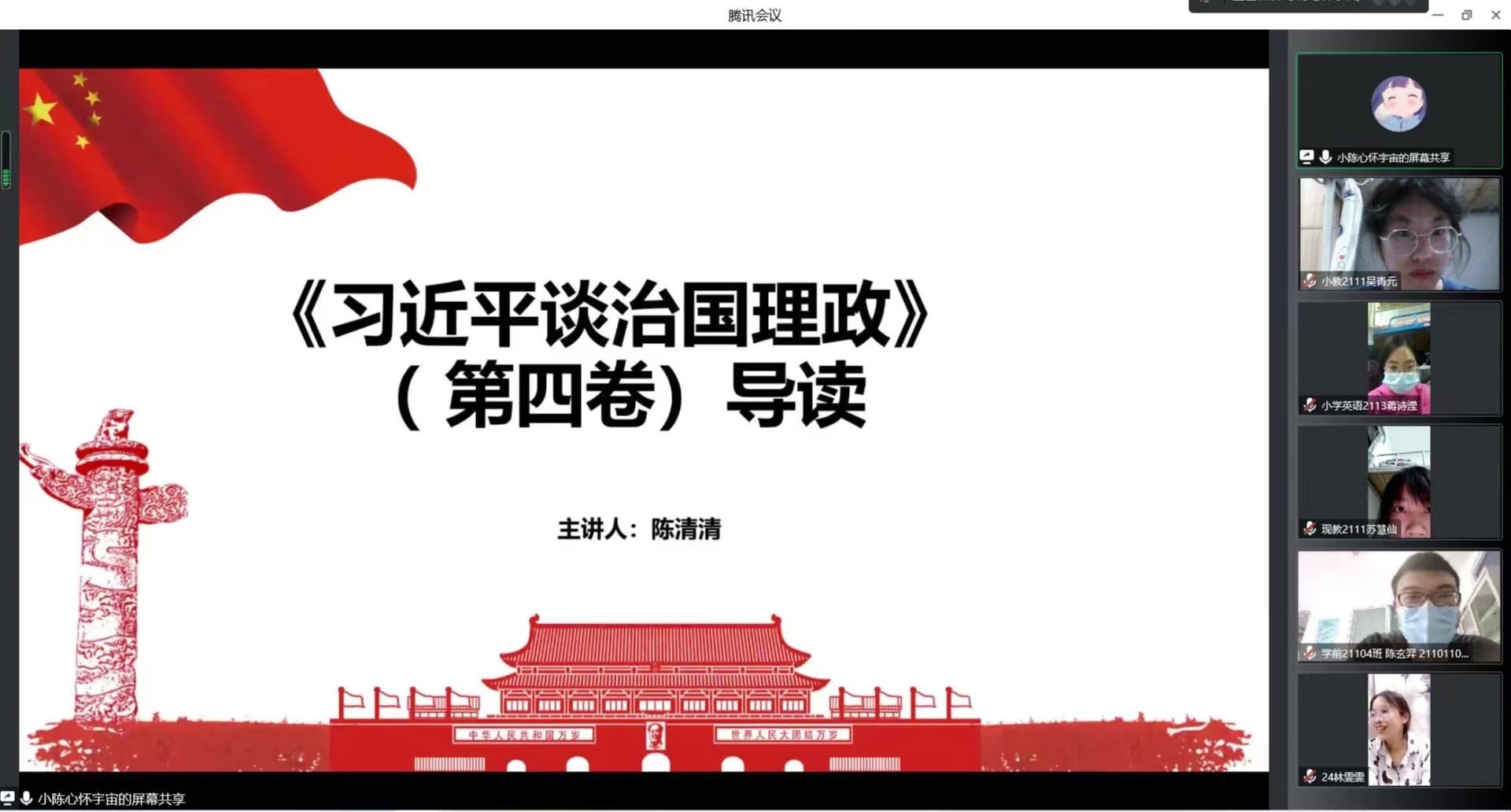 为进一步学深悟透习近平新时代中国特色社会主义思想,2022年11月 27日,马克思主义学院陈清清老师应邀为校"习近平新时代中国特色社会主义思想"读书社开展《习近平谈治国理政》(第四卷)线上导读活动,读书社全体成员参与。