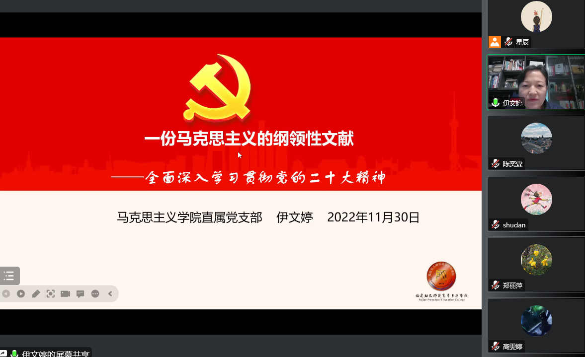 2022年11月30日下午,马克思主义学院党支部全体党员教师在线上开展"一份马克思主义的纲领性文献——全面深入学习贯彻党的二十大精神"的专题党课,此次党课由党支部书记伊文婷主讲,全体党员教师参加学习。