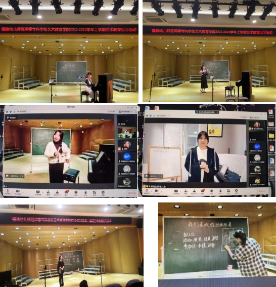 为了更好地向学院汇报艺术教育实习成果,23届每位实习生们拍摄制作1个微课,由实习带队教师、小学指导教师以及学院实习领导小组层层选拔,从仓山区第一中心小学、鼓楼区第一中心小学、晋安区第一中心小学等七个教育实践基地的实习队中各遴选出1节优质的音乐专业微课和1节美术专业微课,在音乐厅分别开展音乐专业、美术专业现场片段教学汇报展示活动。为避免防疫阶段的线下聚集形式,此次的展示活动通过腾讯会议向音乐教育专业、美术教育专业、艺术教育专业的480多位参与教育见习的同学全面推送现场内容,同时邀请专家、一线名师、学院实习带队教师、音乐美术教学法课程教师云端相聚,协同参与此次活动。