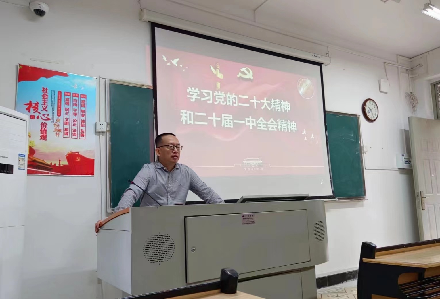 2022年11月30日上午,校党委副书记邹雄伟在教学楼B204为我校人文教育学院小学教育专业2211班同学讲授"学习党的二十大精神和二十届一中全会精神"的形势与政策课。