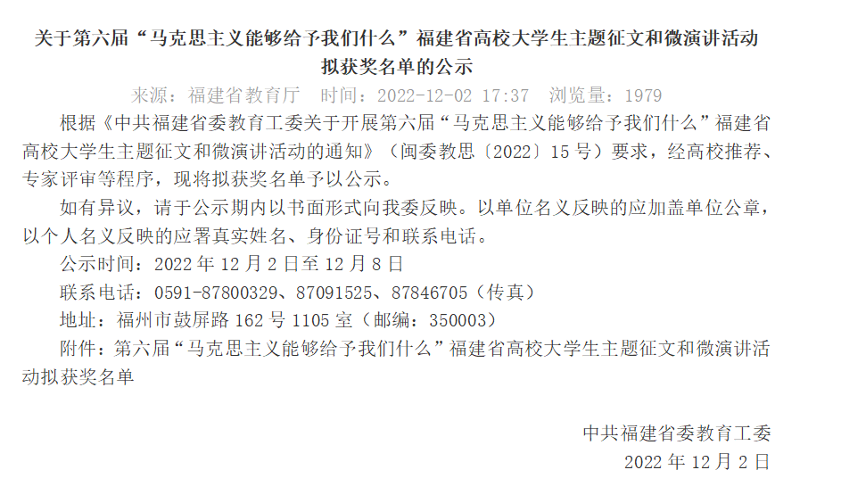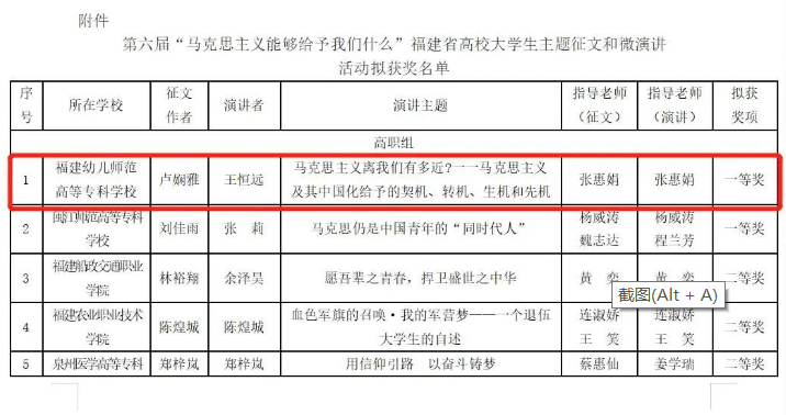 在中共福建省委教育工委举办的第六届"马克思主义能够给予我们什么"福建省高校大学生主题征文和微演讲活动中,我校马克思主义学院张惠娟老师指导学前教育学院卢娴雅和王恒远两位同学参加的主题征文和微演讲比赛,均获我省高职组一等奖的第一名,这是历年来我校在此次比赛中获得的最佳战绩。