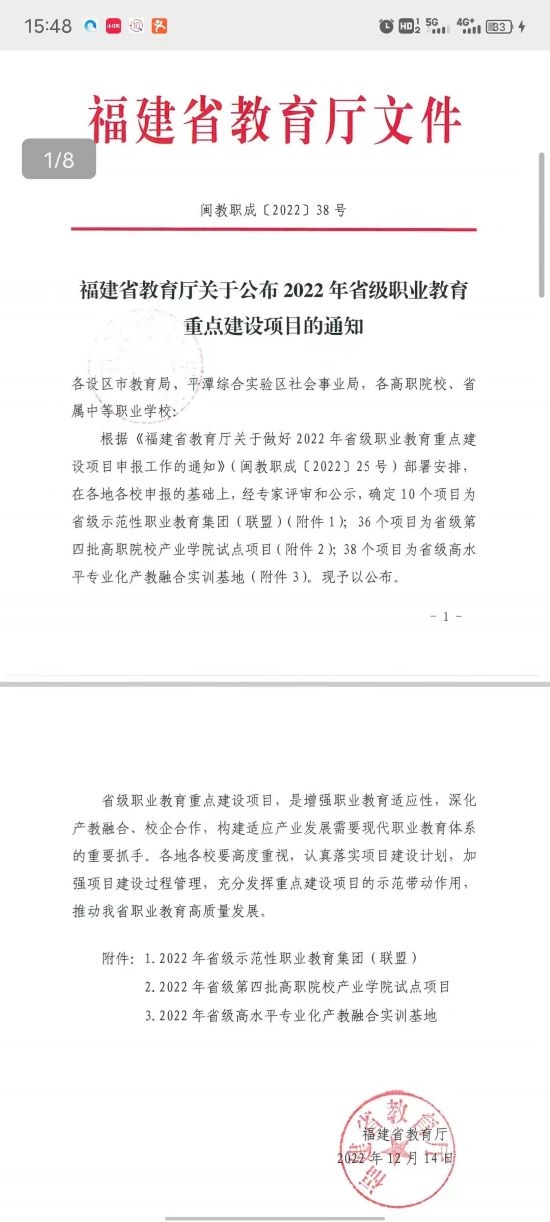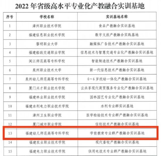 2022年12月14日,福建省教育厅公布2022年省级职业教育重点建设项目,确定我校学前教育专业群产教融合实训基地为省级高水平专业化产教融合实训基地,这是学前国家级教学创新团队和省高水平专业群建设的阶段性成果。