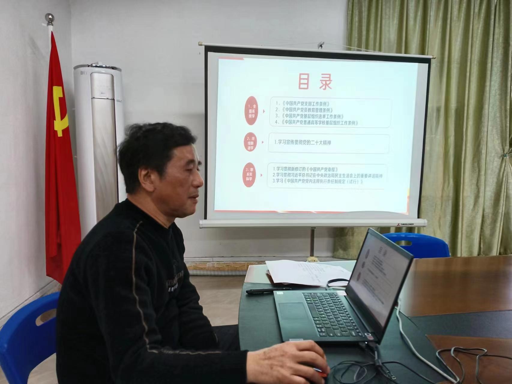 会上,陈福榕书记首先领学了党的二十大精神,指出学习贯彻党的二十大精神,关键就是抓落实,将在工作中立足岗位,勇于担当,坚持"实"的作风,练就"硬"的本领,真正做到全心全意为人民教育事业服务,为学校、学院发展奉献智慧和力量。接着,他组织全体党员学习新修订的《中国共产党章程》、"习近平总书记在中央政治局民主生活会上的重要讲话精神"、《中国共产党党内法规执行责任制规定(试行)》等文件精神,要求全体党员要持续深入学习领会党的二十大精神和新修订的《中国共产党章程》,坚定自觉的感悟思想伟力、牢记初心使命、开创学校、学院发展新局面。最后,陈福榕书记组织全体党员共同学习了《中国共产党支部工作条例》《中国共产党党员教育管理条例》《中国共产党基层组织选举工作条例》《中国共产党普通高等学校基层组织工作条例》等条例》,强调全体党员教师必须深化学习,认真研读规定,强化廉洁自律意识,加强自身作风建设,做到内化于心,外化于行,切实抓好各项规定落到实处。