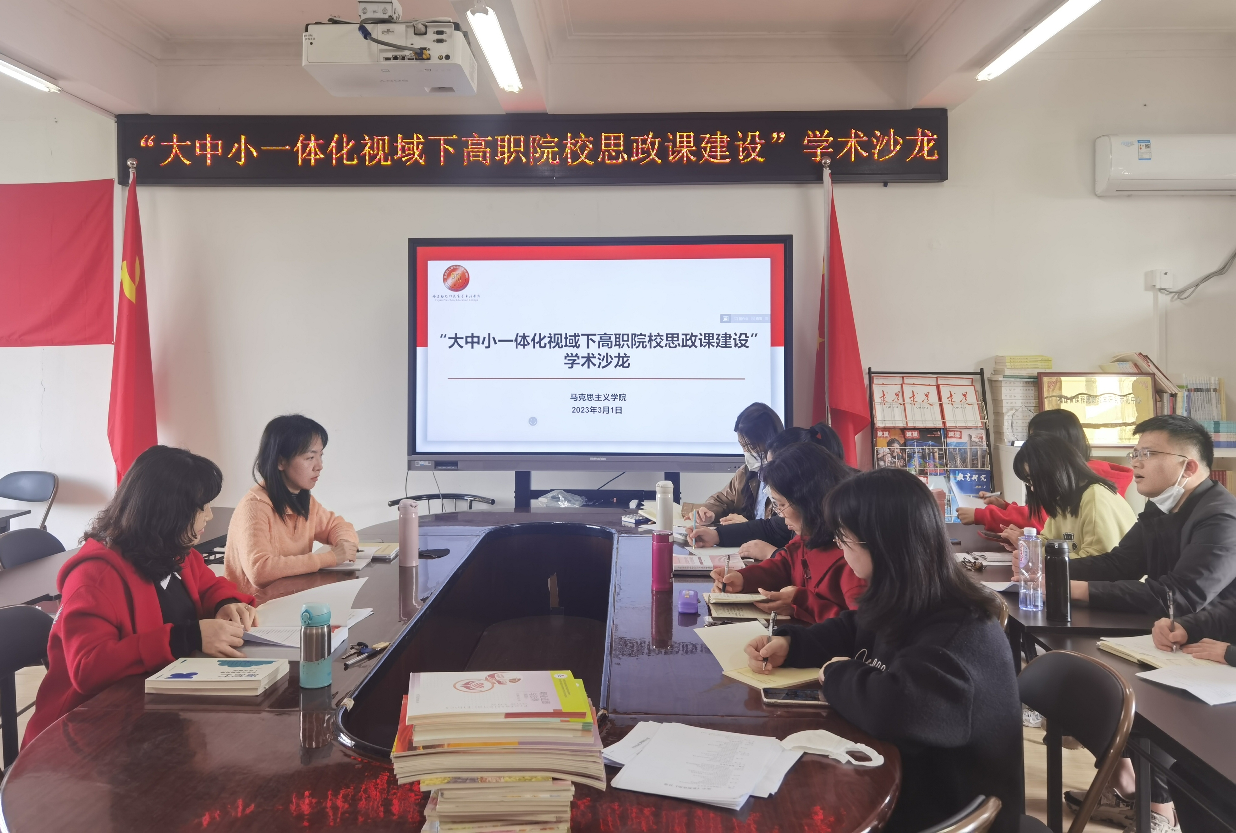 2023年3月1日下午,马克思主义学院于学院会议室开展"大中小一体化视域下高职院校思政课建设"学术沙龙。此次活动由伊文婷院长主讲,郑舒丹副院长主持,马院全体教师参加。