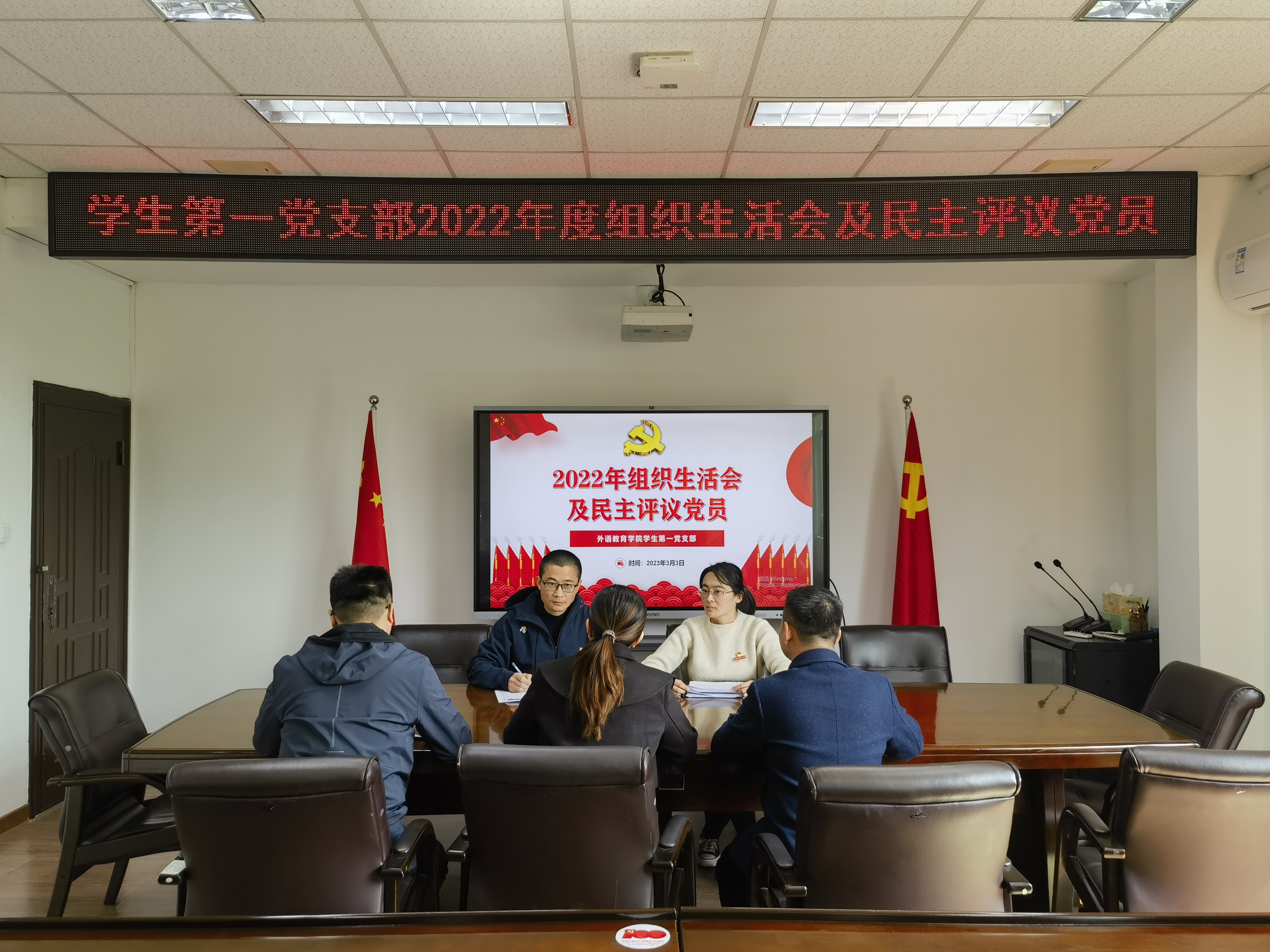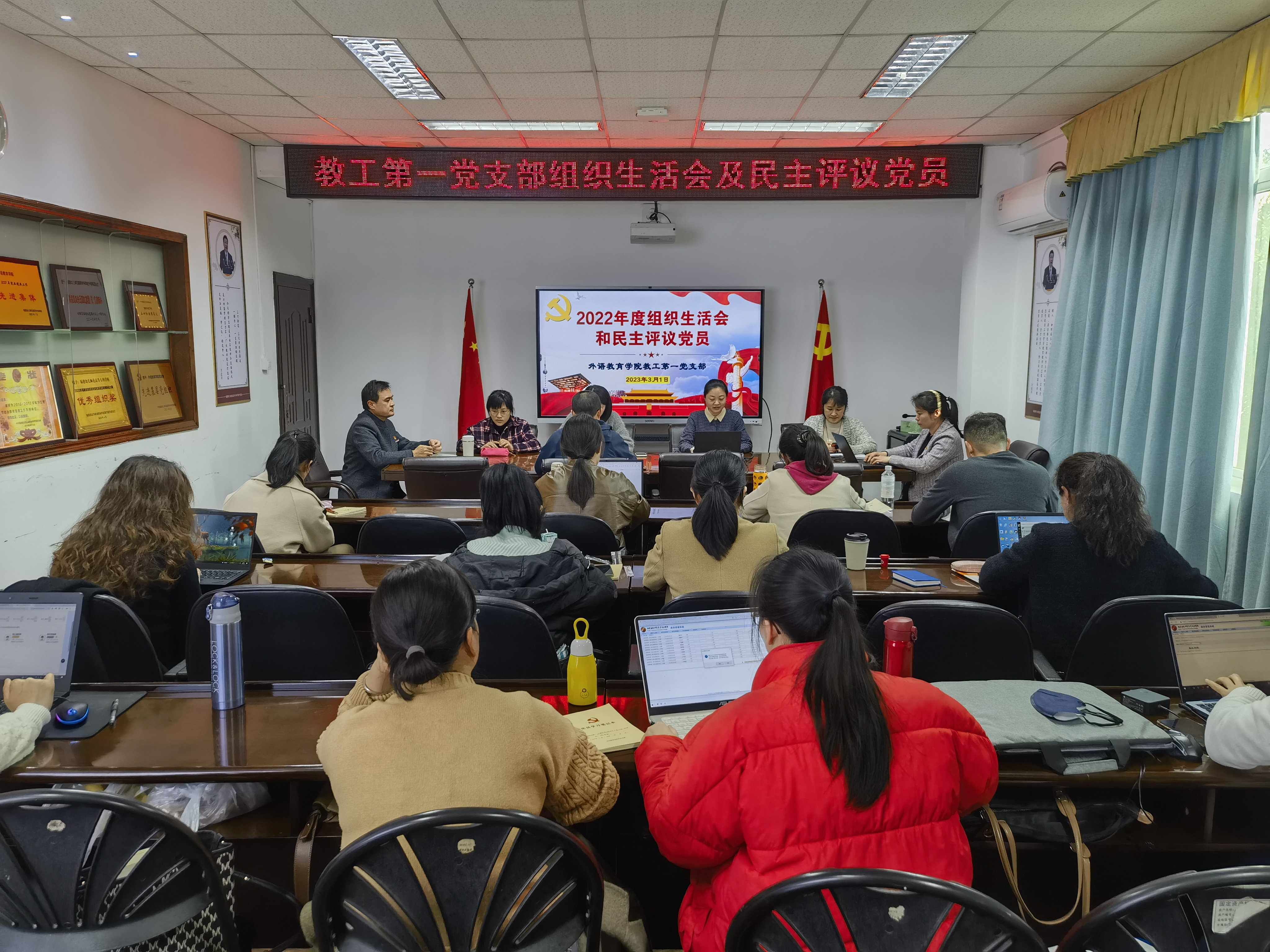 外语教育学院党总支两个党支部分别于3月1日、3日召开2022年组织生活会,并开展党员民主评议工作,党总支委员分别到两个支部进行了交叉指导、点评。