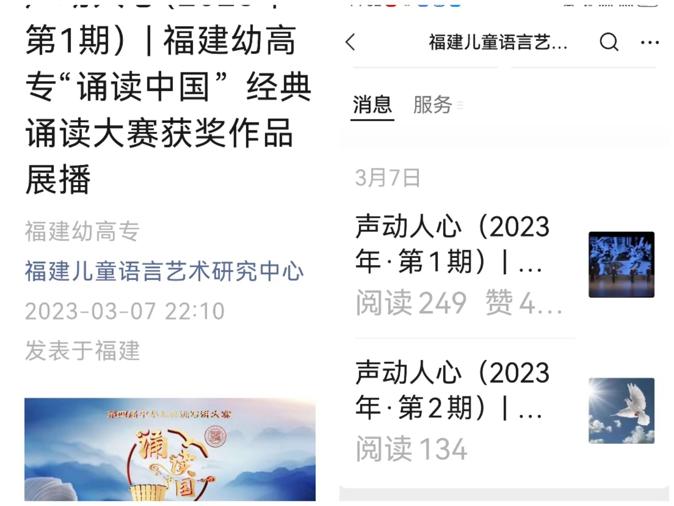 2023年3月7日,通识教育学院儿童语言艺术研究中心举办了"声动人心·诵读中国"线上经典诵读活动,并在"福建儿童语言艺术研究中心"公众号上进行获奖作品展播。本中心积极贯彻落实习近平总书记关于推广普及国家通用语言文字、传承中华优秀传统文化的重要指示批示精神,在我校参加福建省第四届经典诵读大赛获奖作品基础上,组织师生对经典诵读语言的表达规律开展研讨,全面深入实施中华经典诵读工程,营造我校学生通过有声语言亲近中华经典、热爱中华经典的校园文化氛围。