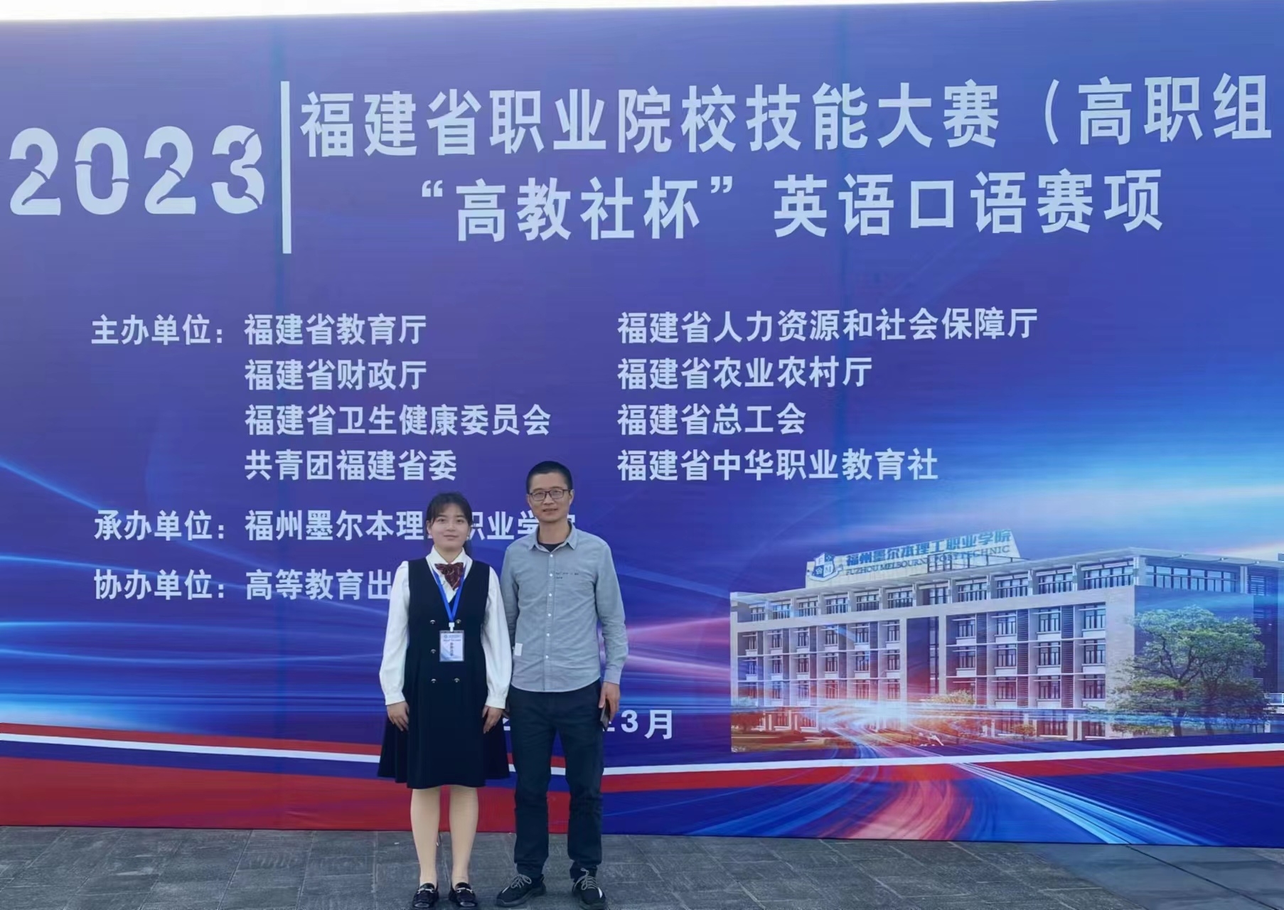 2023年福建省职业院校技能大赛(高职组)"英语口语"赛项今日在福州墨尔本理工学院圆满结束,我校小学英语教育专业学生黄心怡(指导教师:叶一青)在"中国故事""情景交流""职场描述""职场辩论"等四个环节的淘汰赛中脱颖而出,最终获得二等奖的佳绩。