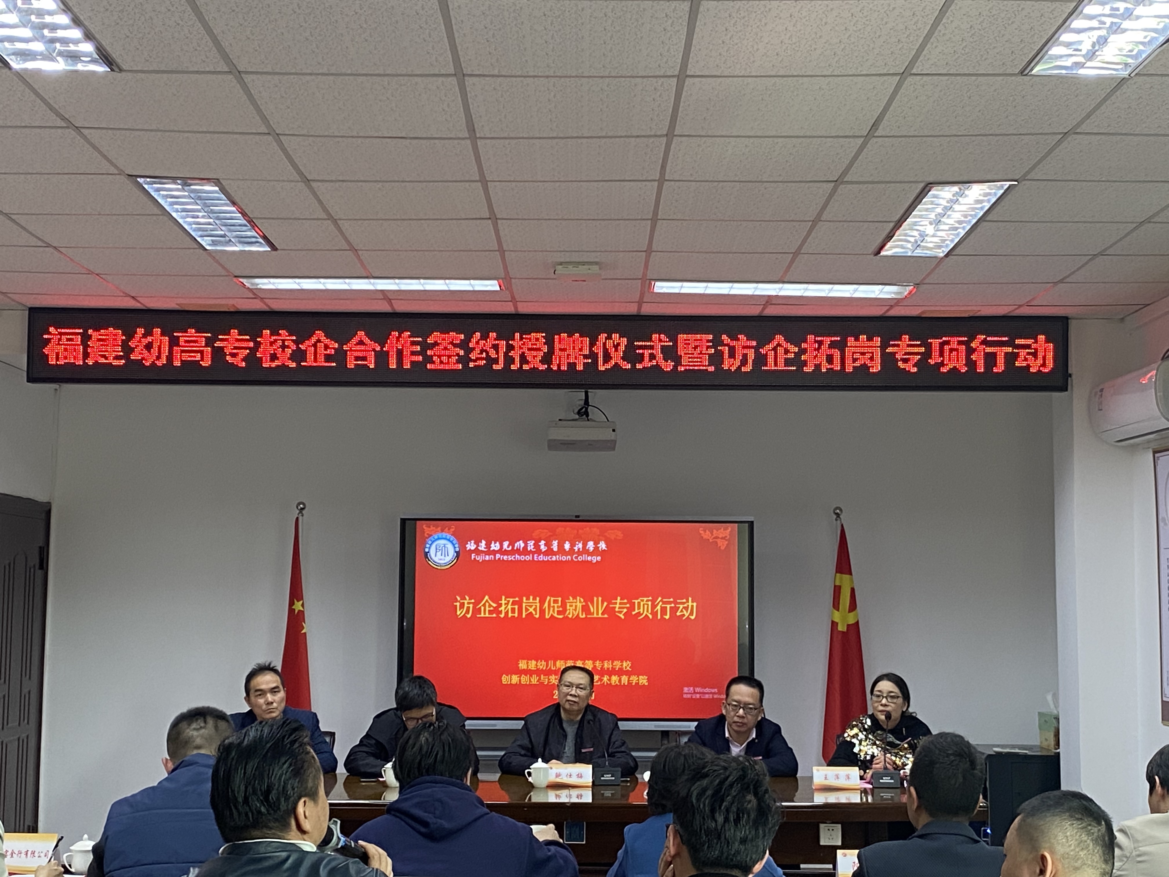 3月13日,"福建幼儿师范高等专科学校校企合作签约授牌仪式暨访企拓岗专项行动"在学校金山校区开展,10所企业代表出席本次活动,学校党委书记鲍仕梅、校党委副书记邹雄伟莅临指导,学校创新创业与实训中心主任周海林,教务处副处长叶圣军,艺术教育学院院长王萍萍、党总支书记姜琪、副院长陈青、学生科科长章涛,以及各专业专任教师共同参会。会议由院长王萍萍教授主持。