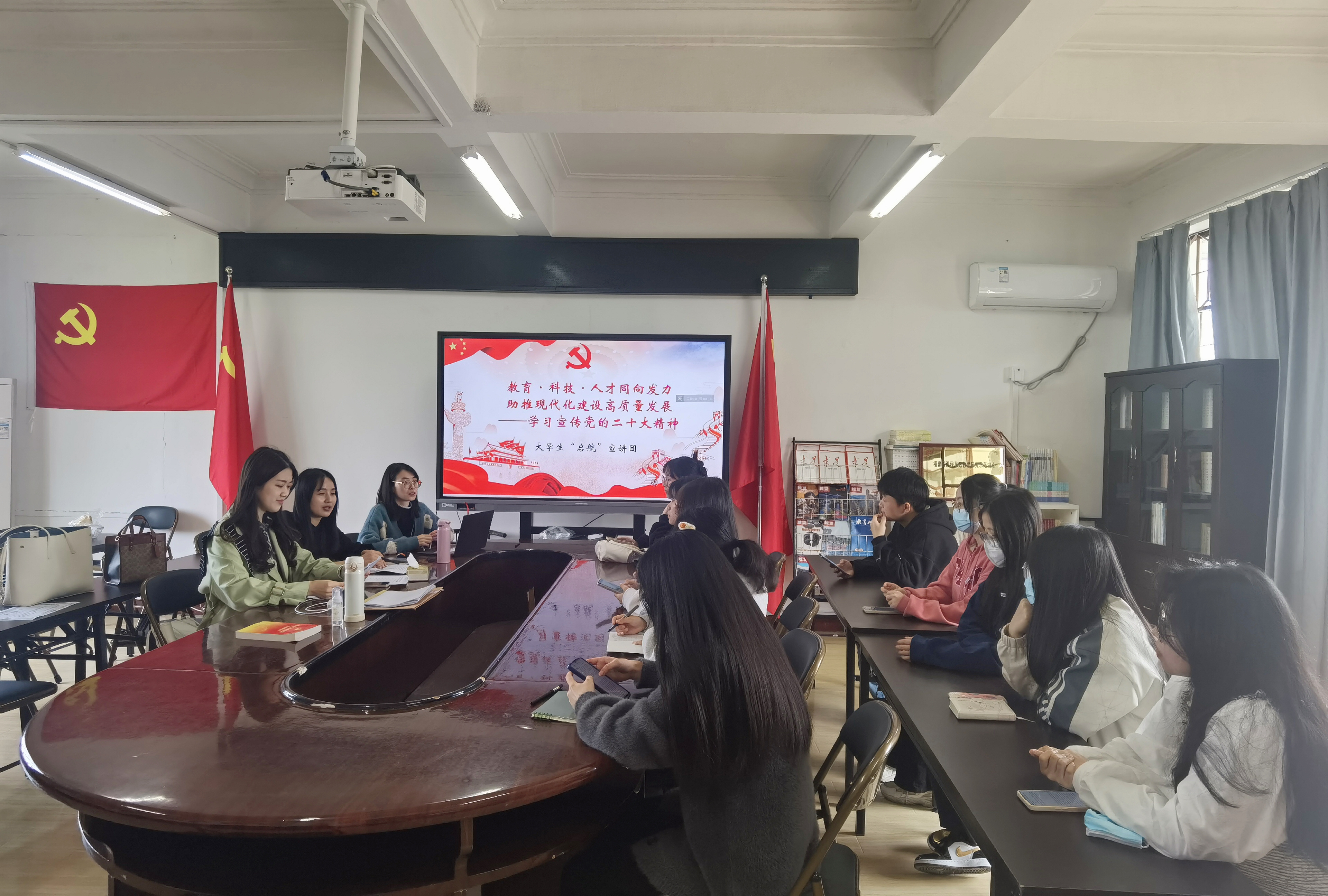 为及时深入学习宣传贯彻党的二十大精神,把我校学生的思想和行动统一到党的二十大精神上来,2023年3月15日中午,马克思主义学院对大学生"启航"宣讲团成员开展宣讲党的二十大精神培训会。大学生"启航"宣讲团指导教师胡新蕾老师、陈雨露老师和李缀老师以及全体宣讲团成员参加了此次会议。