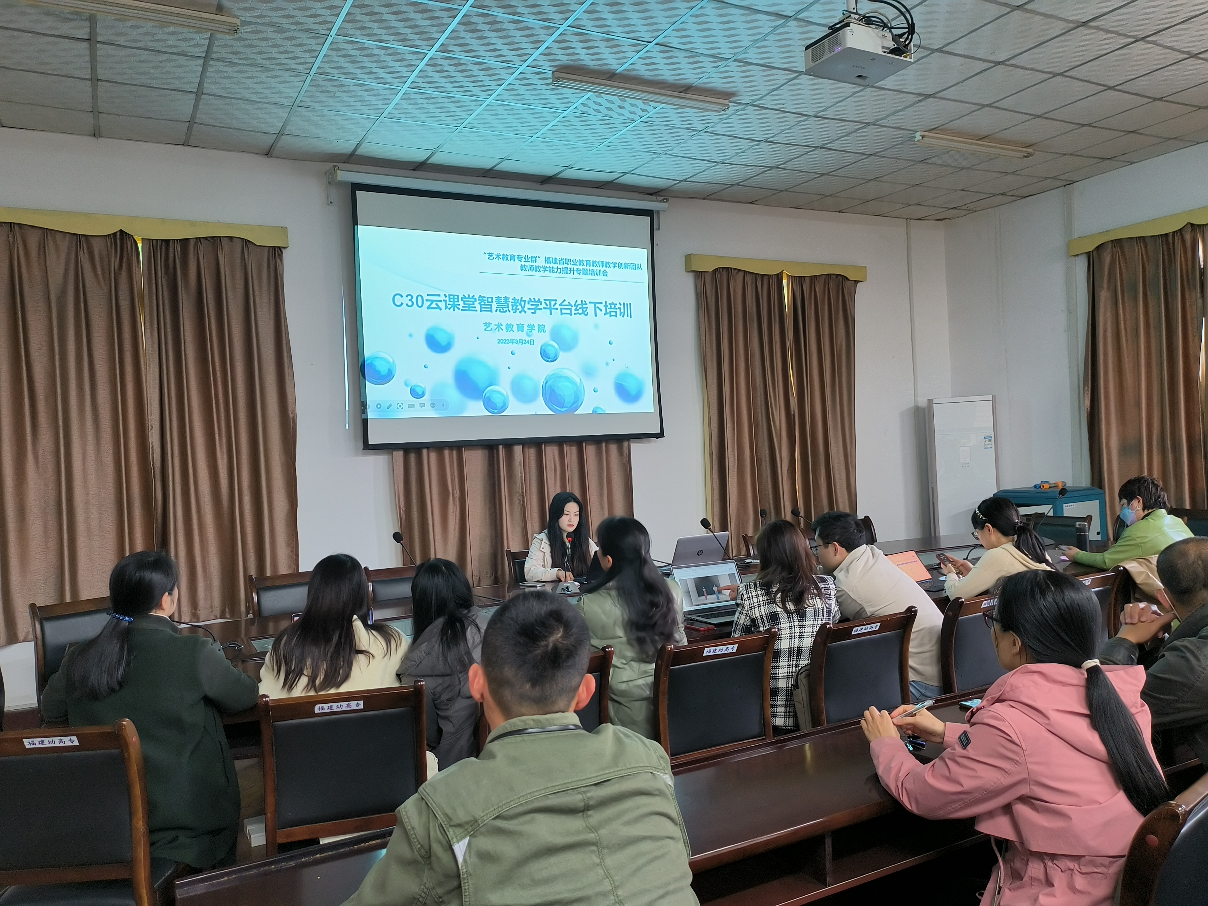 为提升我院教师信息化教学能力,提高信息化教学水平,充分利用线上、线下教学资源等信息化教学手段全面开展信息化教学。3月24日,在学校214会议室,艺术教育学院开展了云课堂智慧教学平台应用培训工作,学院陈青副院长、颜艳副院长、申报在线精品课程的教师与骨干教师参加了本次培训。