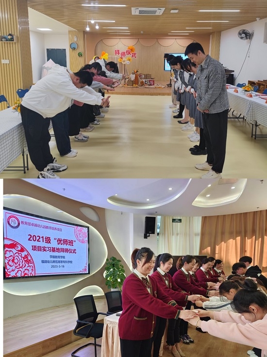 2023年3月16日上午,学前教育学院分别在福建省直机关幼儿园、福州市直机关幼儿园、福州市花巷幼儿园以及福州市旗汛口幼教集团井大园同时进行隆重的拜师仪式。学前教育学院吴丽芳院长、福建幼高专教务处叶圣军副处长、学前教育学院林萍副院长、肖英娥副院长、王先达副教授、幼高专的各位指导教师和2021级的32位优师班同学们一起参加了此次活动。