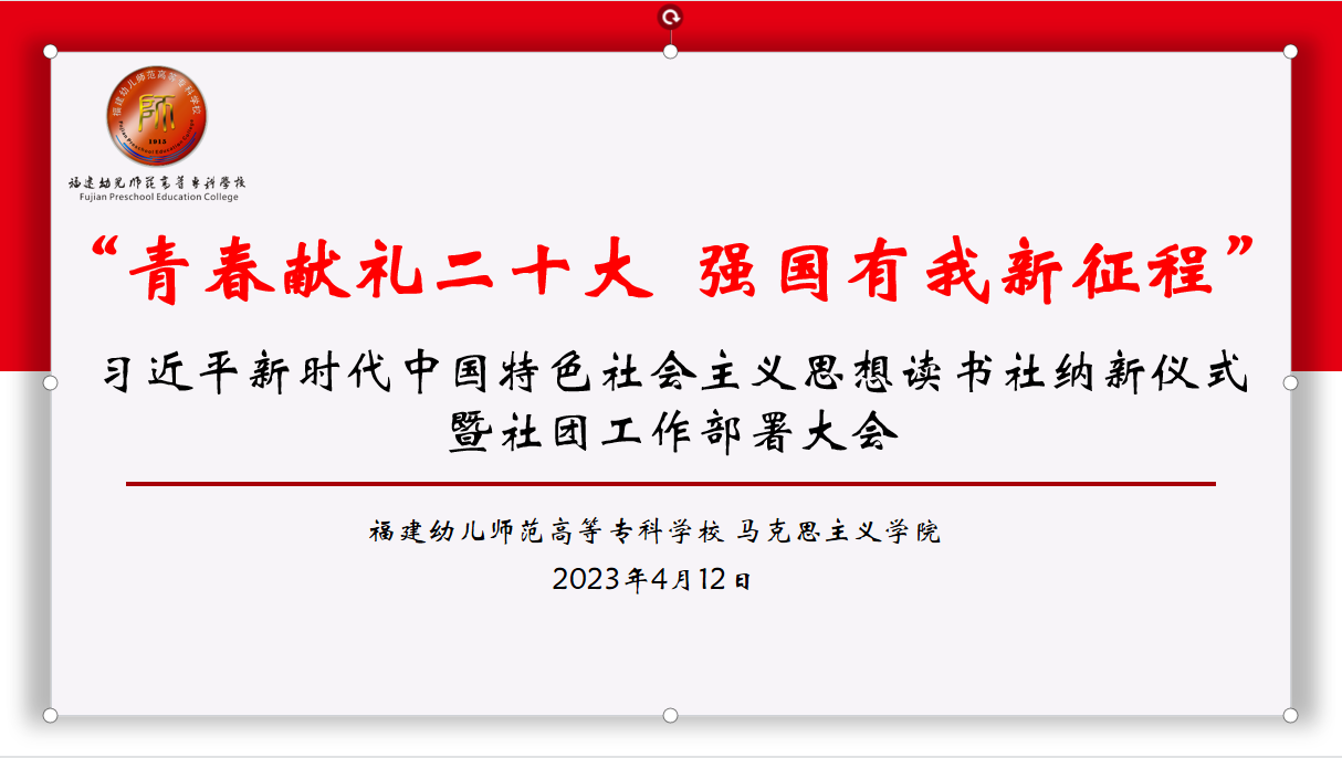 2023年4月12日下午,我校习近平新时代中国特色社会主义思想读书社在综合楼演播厅召开纳新仪式暨社团工作部署大会,马克思主义学院全体教师及读书社全体社员参会。此次大会由马克思主义学院胡新蕾老师主持。