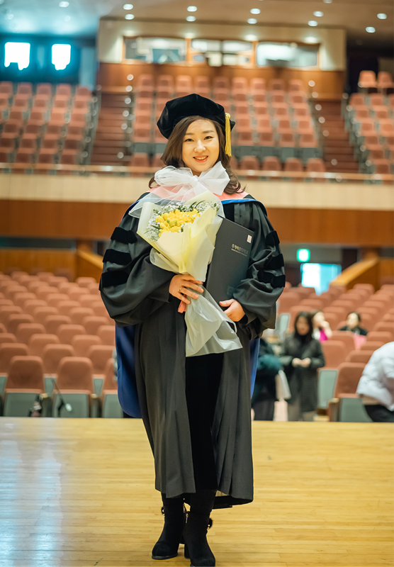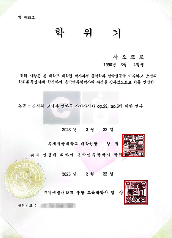 肖豆豆老师就读博士学位三年多时间,在韩国秋溪艺术大学声乐指导教授陈贵玉教授以及论文指导教授金艺珍教授等导师的精心指导下,她攻坚克难,克服了语言、唱法转换、博士毕业论文研究等诸多难关,学习成绩优异,成绩总分绩点达到4.25(总分4.5),获得韩国秋溪艺术大学学业奖学金。肖豆豆老师的学习成果不仅是个人努力的成果,也离不开学校和学院给予的支持与关心。