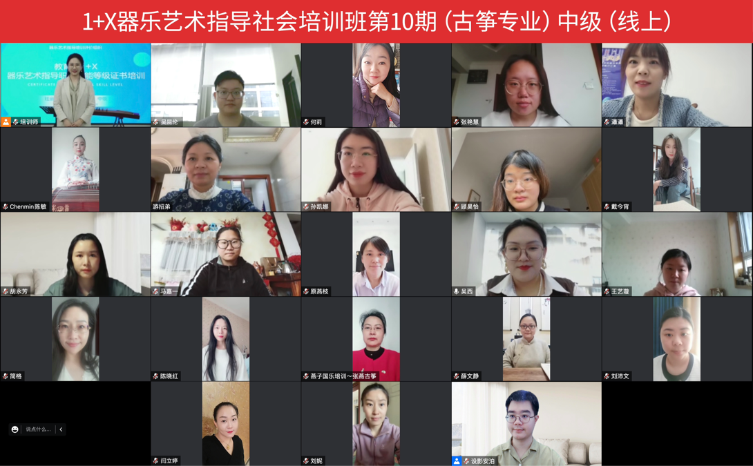 教育部1+X器乐艺术指导职业技能等级证书社会培训班第十期(古筝中级第一期)于4月10日至13日在深圳育星教育集团总部举办。艺术教育学院古筝专业教师申毅作为首批教育部1+X器乐艺术指导职业技能高级培训师,受邀出席本次社会培训班并担任授课主讲教师。本次培训是古筝专业(中级)专场的第一次培训,课程采取线上直播教学模式进行,来自全国的二十位古筝教师进行了为期4天的直播课程学习。