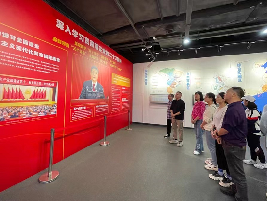 在主题党日馆内,全体学员在党旗前庄严宣誓,重温入党誓词。随后,在讲解员的引导下,学员们详细了解了平潭在党的领导下,在开展革命斗争、经济建设、开放开发所取得的辉煌成就以及习近平总书记为平潭开放开发擘画的宏伟战略蓝图,进一步加深了对习近平新时代中国特色社会主义思想的理解和领会。