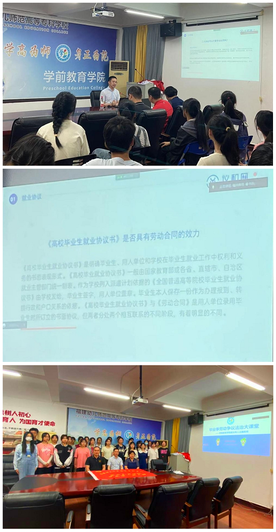 本次"毕业季劳动争议法治大课堂"作为学前教育学院"党建+就业"融合系列活动之一,将有力助推大学生提高对劳动法律法规的理解和认识,加强对就业求职中各种问题风险的规避,促进毕业生合理利用法律武器来保障自身的权益。接下来,学前教育学院将加大对大学生进行就业创业指导,为毕业生的更高质量更充分就业创业提供更好的服务。