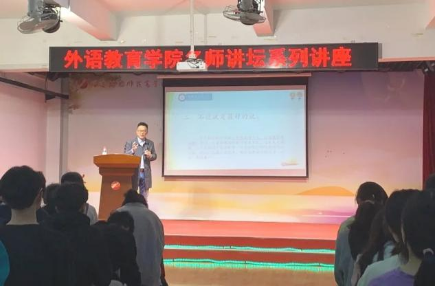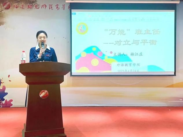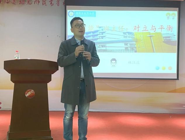 陶行知先生曾经说过:"爱满天下,乐育英才。" 为引导小学英语教育专业师范生进一步成长成材,外语教育学院特邀福州市东升小学书记、校长林江庄开展题为《"万能"班主任--对立与平衡》的专题讲座。学院副院长(主持工作)陈文华教授主持讲座,2022和2021级小学英语教育专业同学参加。