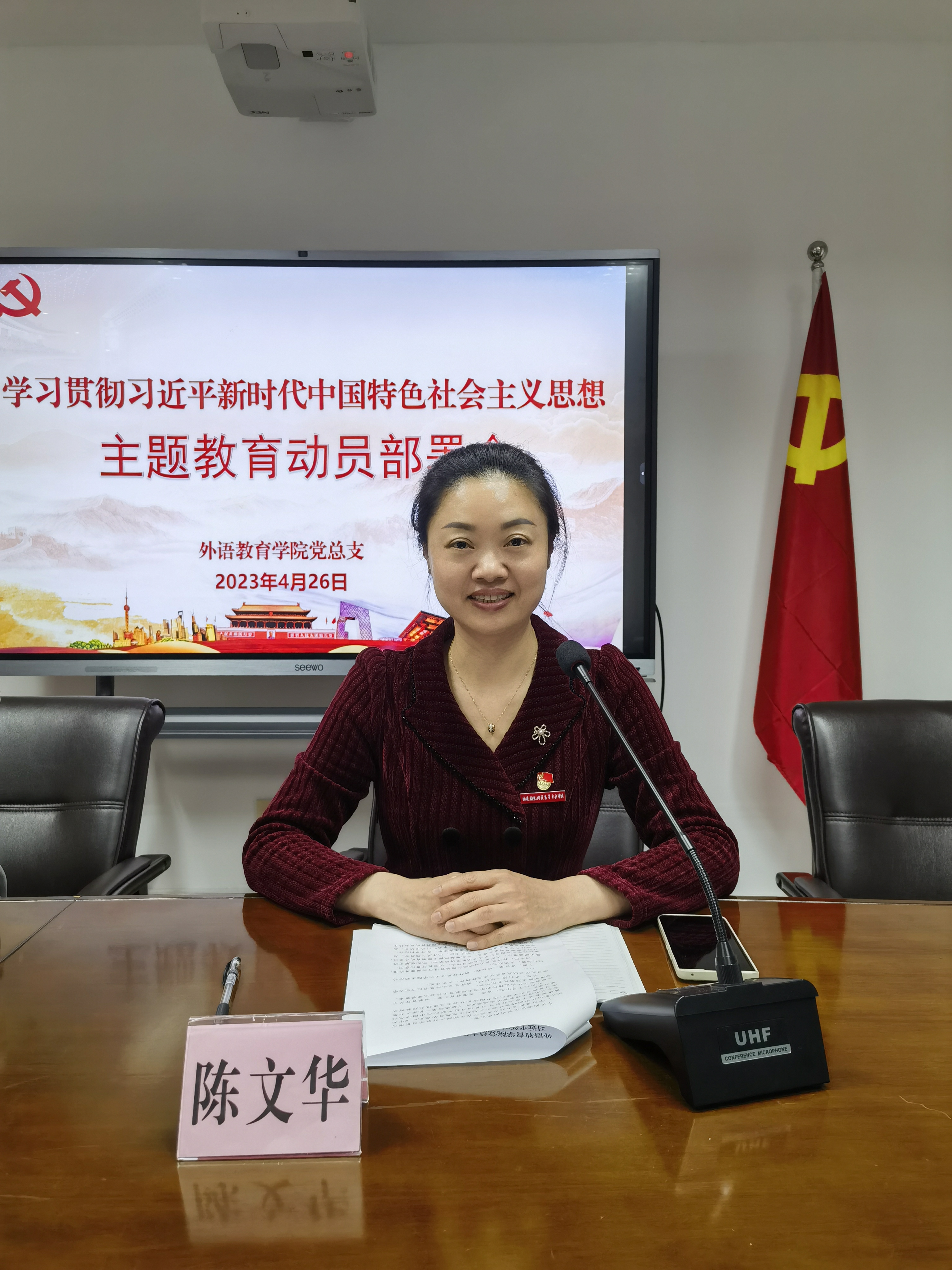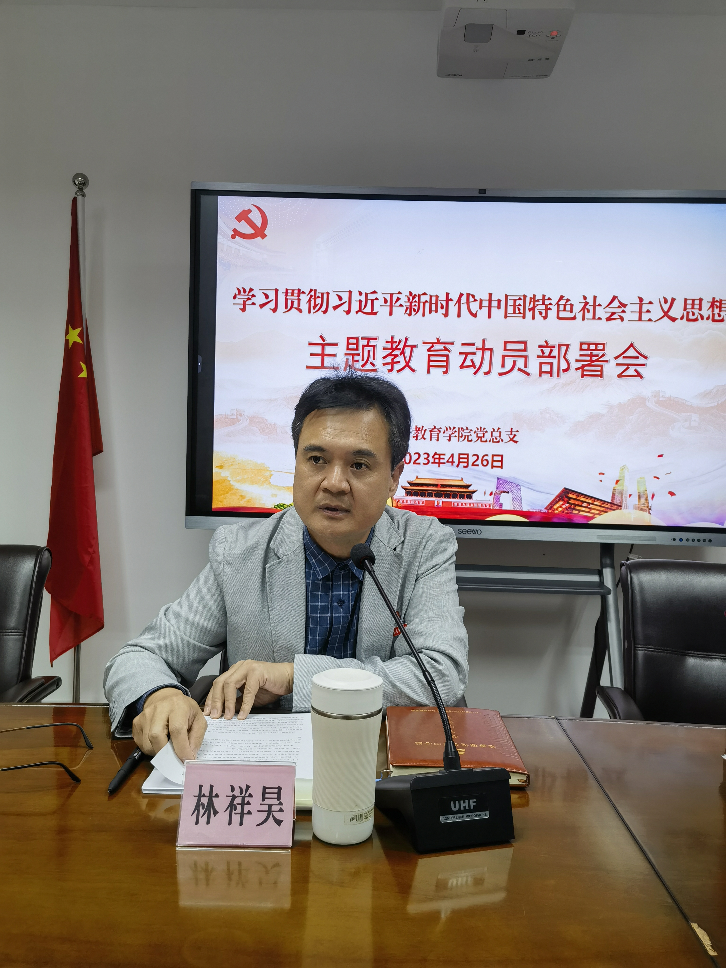 4月26日下午,外语教育学院党总支召开学习贯彻习近平新时代中国特色社会主义思想主题教育动员部署会,党总支书记林祥昊作动员讲话,党总支副书记、副院长(主持工作)陈文华主持会议,学院全体党员参加会议。
