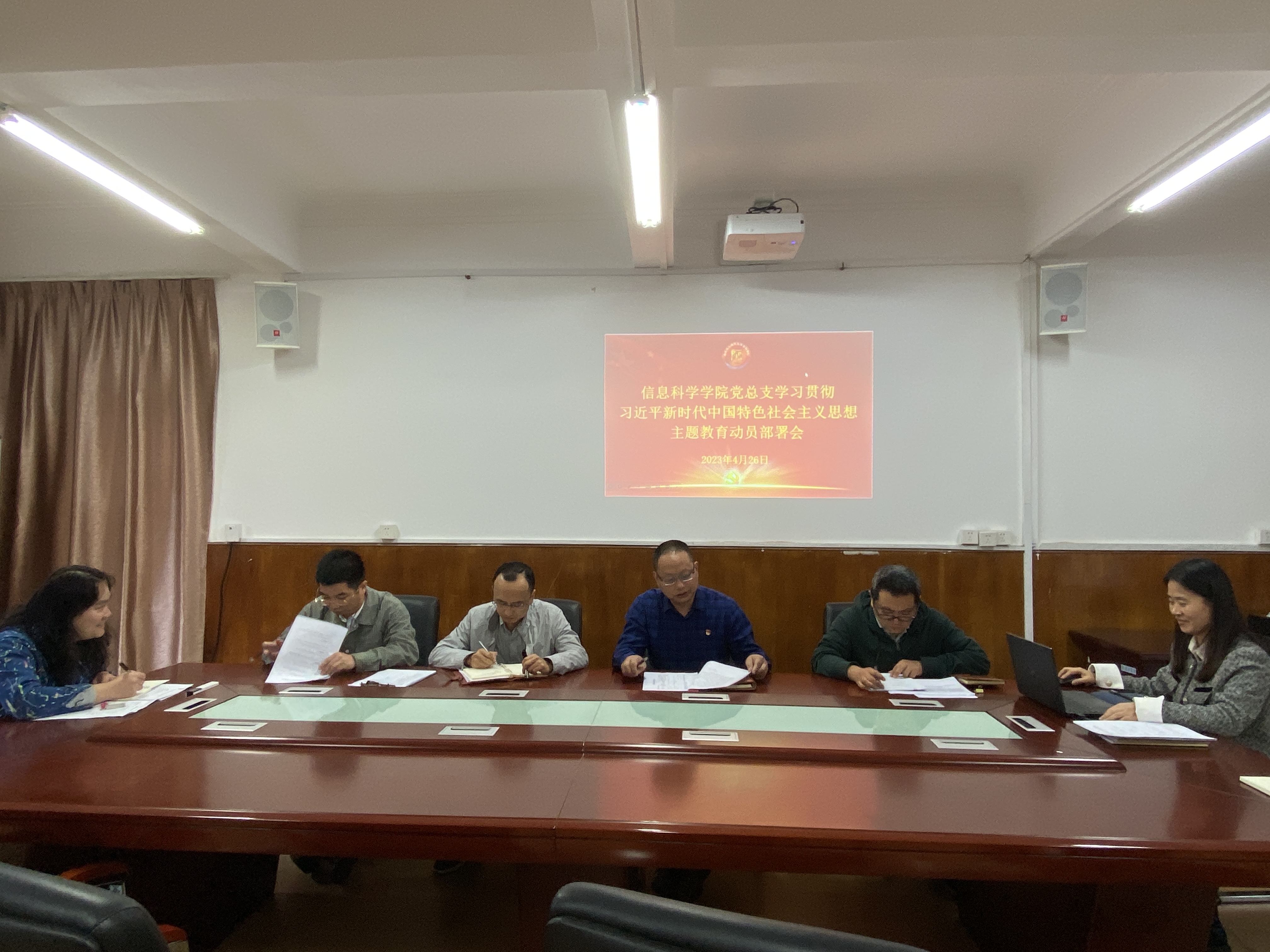 4月26日,信息科学学院党总支召开"学习贯彻习近平新时代中国特色社会主义思想主题教育部署会暨主题教育读书班开班仪式"。学院党总支书记余深焰、院长陈宁华出席,党总支委员、部分党员参加会议。