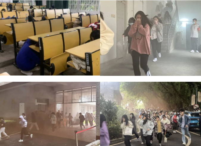 演练从教学A楼开始,第一声警报响起后,同学们双手抱头或用书包保护头部,迅速下蹲,蜷缩身体藏在桌子底下。在第二声警报响起后,大家捂住口鼻,迅速撤离教室,沿着预定安全逃生疏散路线快速、有序地撤离到操场,各班疏散到集结区域。