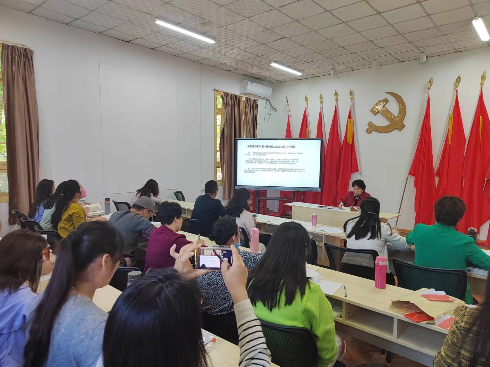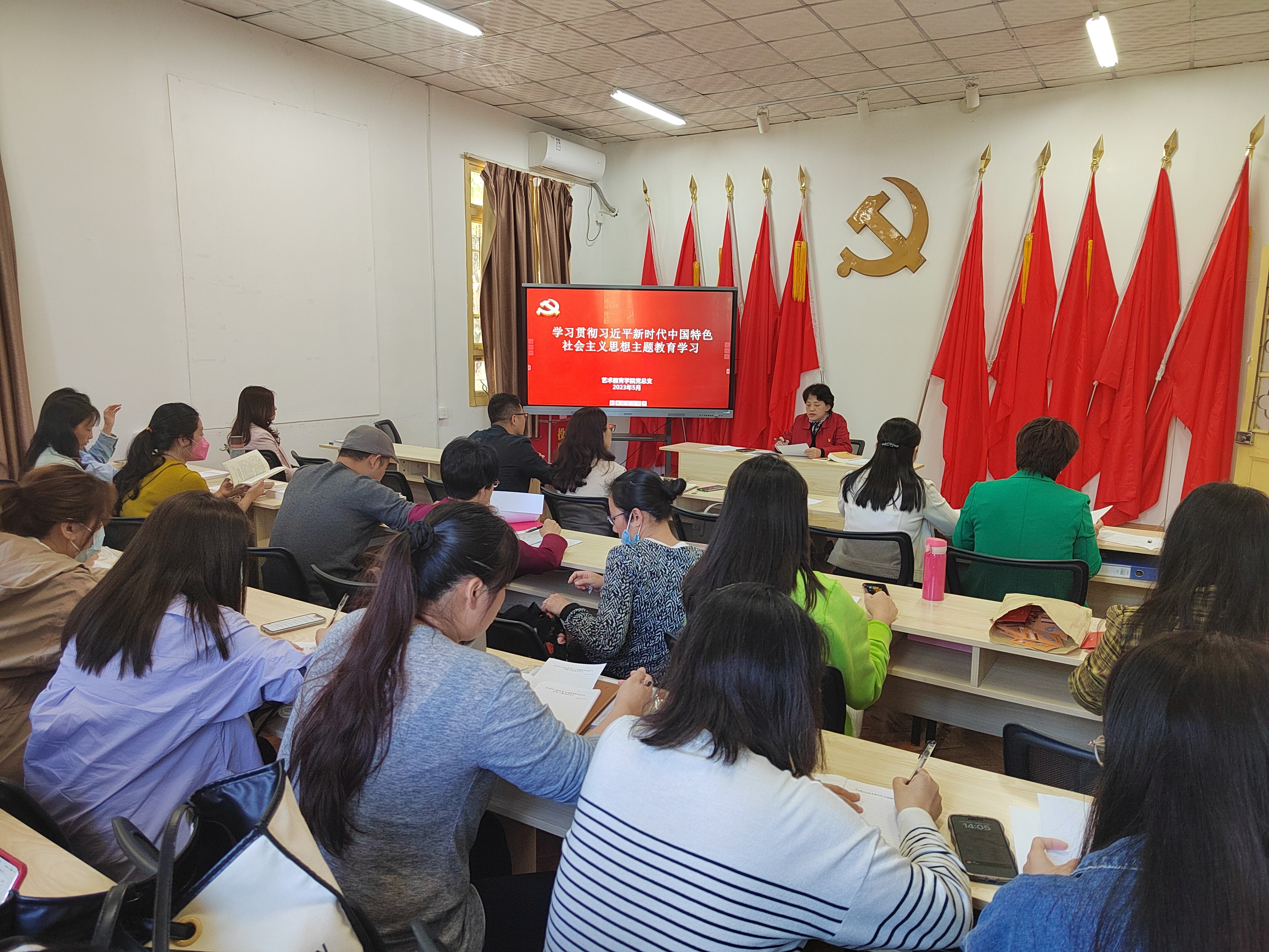 5月10日下午,艺术教育学院党总支召开全体党员主题教育学习会。党总支书记姜琪领读了《习近平著作选读》(第一卷)中的篇章《关于坚持和发展中国特色社会主义的几个问题》,学习围绕四个要点,重点从9个方面阐述了关于坚持和发展中国特色社会主义的几个问题。学习会还观看了山东大学马克思主义学院周向军教授《关于坚持和发展中国特色社会主义的几个问题》的讲座视频。