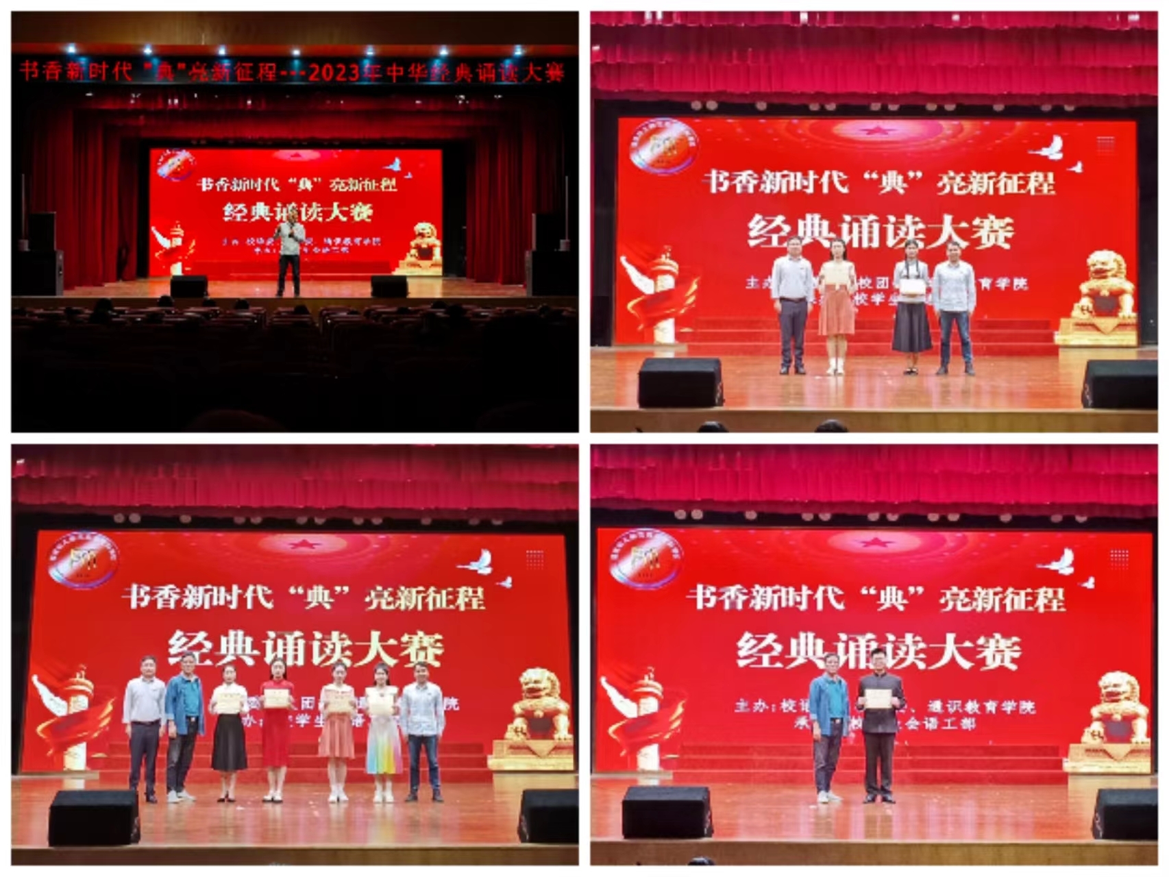 2023年 5月11日,校语委、校团委、通识教育学院、福建儿童语言艺术研究中心联合举办2023年"书香新时代 '典'亮新征程"诵读中国经典诵读大赛,来自我校4个学院的11支队伍带来了一场精彩的视听盛宴。本次大赛旨在提升我校广大青年学生的语言文字应用能力和语言文化素养,激发对中华经典的热爱,营造爱读书、读好书、善读书的浓厚氛围。选手们用声音诵读古今经典,弘扬中国精神,诠释中华优秀文化内涵,彰显了中华语言文化魅力,展示了我校学生的师范生语言基本素质。最后,学前教育学院的王恒远以作品《父母之河》夺得桂冠,另有6支队伍分别获二、三等奖。校团委胡华荣书记发表讲话,肯定了学生们诵读水平,他指出,经典诵读活动的开展不仅让学生品味了中华传统文化的源远流长、博大精深,更为我校学生的成长提供了强大的精神动力,激发了学生的爱国之情、强国之志。