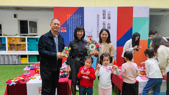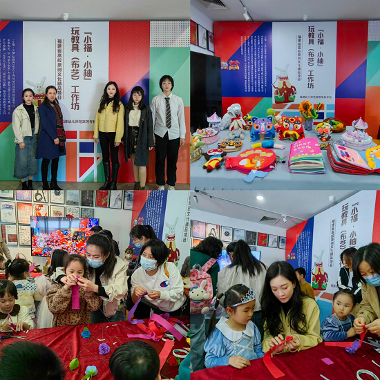 2023年3月4日,"小福·小柚"玩教具(布艺)工作坊应邀参加由福建省美术家协会少儿美术艺术委员会主办、福建省学前美术教育研究中心协办的"2023年首届厦门市幼儿园儿童作品联合展",学前教育学院美术教研室主任方琳宇副教授带领青年教师马紫君、李子筠参展。该展览以"阳光·欢笑·中华情"为主题,甄选1200幅优秀儿童美术作品参展,内容涵盖摄影、泥塑、剪纸、绘画等多种艺术创作形式。本次展演活动中,"小福·小柚"玩教具(布艺)工作坊立足传统文化,以形式多样、玩教合一、创意新颖的布艺玩教具作品吸引众多参观者的欣赏与互动。工作坊采用亲子合作、师幼互动、生生联动等多样化的互动形式,在师生之间建立了一个"零距离"的交流平台。教师引导幼儿通过观察、体验、现场制作等方式,亲手制作布艺玩教具作品,使幼儿充分体验到布艺手工的乐趣,不仅增强了布艺玩教具的亲近性与互动性,也让幼儿更加真切的感受到"福"文化的温度与活力,在各环节中实现了"福"文化的活态传承与创新发展。
