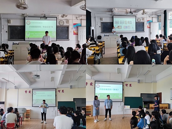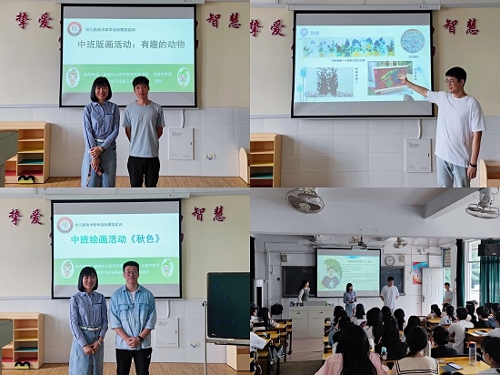 课堂上,杨宏超、黄钦老师和林嘉乐学长分别为学生开展大班版画活动《毕业纪念T恤》、中班版画活动《有趣的动物》和中班绘画活动《秋色》的模拟教学,黄钦老师还带领同学们开展幼儿园版画工作坊的互动体验活动。三位教师基于儿童特点,以创新的教学思路、亲切的教学风格、巧妙的教学方法、有效的师幼互动,很好地激发学前儿童学习兴趣,体现了幼儿园教育活动生活化、游戏化的理念,还通过专题导航、工作坊体验、案例分享和互动点评等方式,有效帮助学生融通理论和实践,把握幼儿园教学改革趋势。随后,吴丽芳教授协同3位青年教学能手立足校企双师的模块化教学,针对模拟教学情况和工作坊展演互动情况,带领学生进行多角度的反思性实践研讨,助力学生提升教育实践和创新能力。