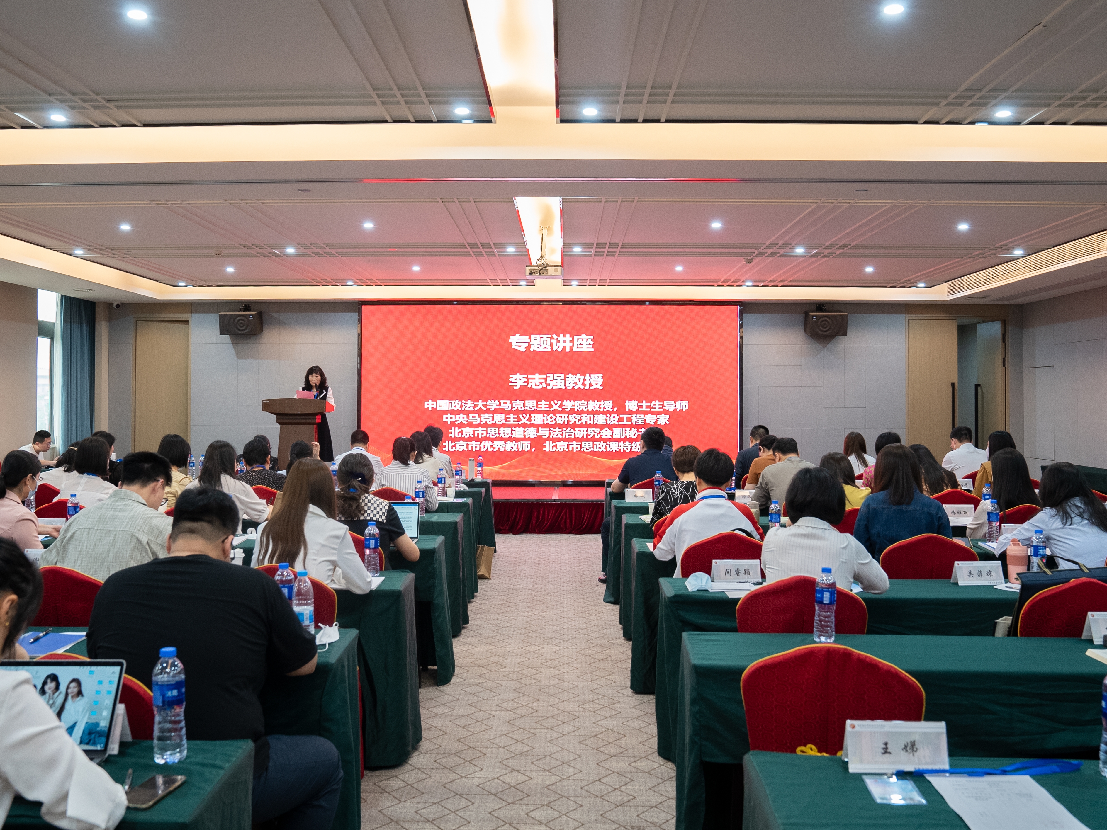 在专家讲座环节,中央马克思主义理论研究和建设工程专家、北京市"思想道德与法治"研究会副秘书长、中国政法大学马克思主义学院教授、博士生导师李志强教授做了题为《"思想道德与法治"课中道德教育与法治教育的逻辑主线》的专题讲座。李志强教授指出逻辑主线是新教材修订的依据,也是进行教学设计的依据,在教学实践中要围绕各章的逻辑主线展开,既有形又有神,避免形散而神不散、形不散却无神、形散神更散的情形。接着,李教授围绕《思想道德与法治(2023年版)》道德教育与法治教育两部分的逻辑主线,从教学内容、教学思路、教学案例等方面对教材第五章、第六章做了深入阐释。李教授的讲座有理论的深度,也有教学实践的亲和度,为思政课教师上好思政课做出了教学指导与示范。