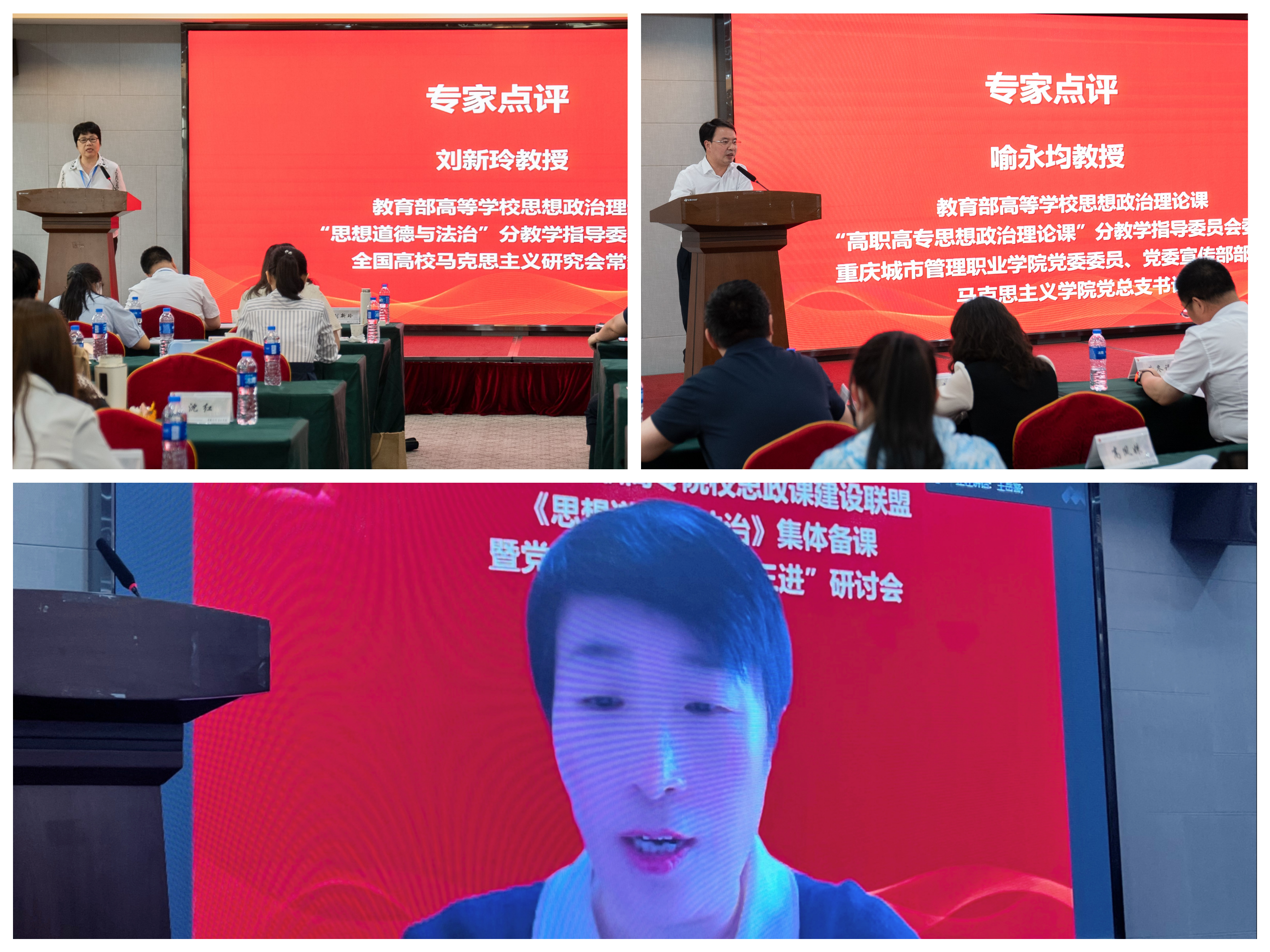 在专家点评中,三位专家对教学展示作了全面系统精辟的点评,充分肯定了各位老师的表现,认为各位老师能够结合学生专业,运用本地案例,选择适合高职学生的教学方法,内容准备精细,教学设计精到,教学展示精彩,同时也提出了教学建议。其中,教育部高等学校思想政治理论课"思想道德与法治"分教学指导委员会委员、福建农林大学马克思主义学院院长刘新玲认为,新课导入要能够抓住学生的关注点;案例要精选细选,深挖背后的道理哲理;问题设计要匠心独运,能够真正触动学生深层次地思考;要有由浅入深的学理分析,达到价值认同。教育部高等学校思想政治理论课教学指导委员会"高职高专思想政治理论课"分教学指导委员会委员、山东商业职业技术学院马克思主义学院院长王岳喜建议,思政教师要进行深入的学理研究,要有整体的目录以清晰呈现教学逻辑。教育部高等学校思想政治理论课教学指导委员会"高职高专思想政治理论课"分教学指导委员会委员、重庆城市管理职业学院党委宣传部部长、马克思主义学院党总支书记喻水均为联盟的扎实工作和教师的精彩展示点赞,从素材选取的科学性、讲授内容的精准度、案例与内容的匹配度、教学与教材的契合度、课程逻辑的完整性作了全面点评,同时从如何提升理论的深度、如何推动思政课程与课程思同向同行、如何提升教学仪态、如何强化学生互动、如何应用信息化手段、如何选用适应高职思政课的教学方法、如何选取案例资源、如何提出真问题、如何选取教学选题、如何充分体现习近平新时代中国特色社会主义思想和党的二十大精神的"三进"、注意区分日常教学和教学比赛等十一个方面提出建议。