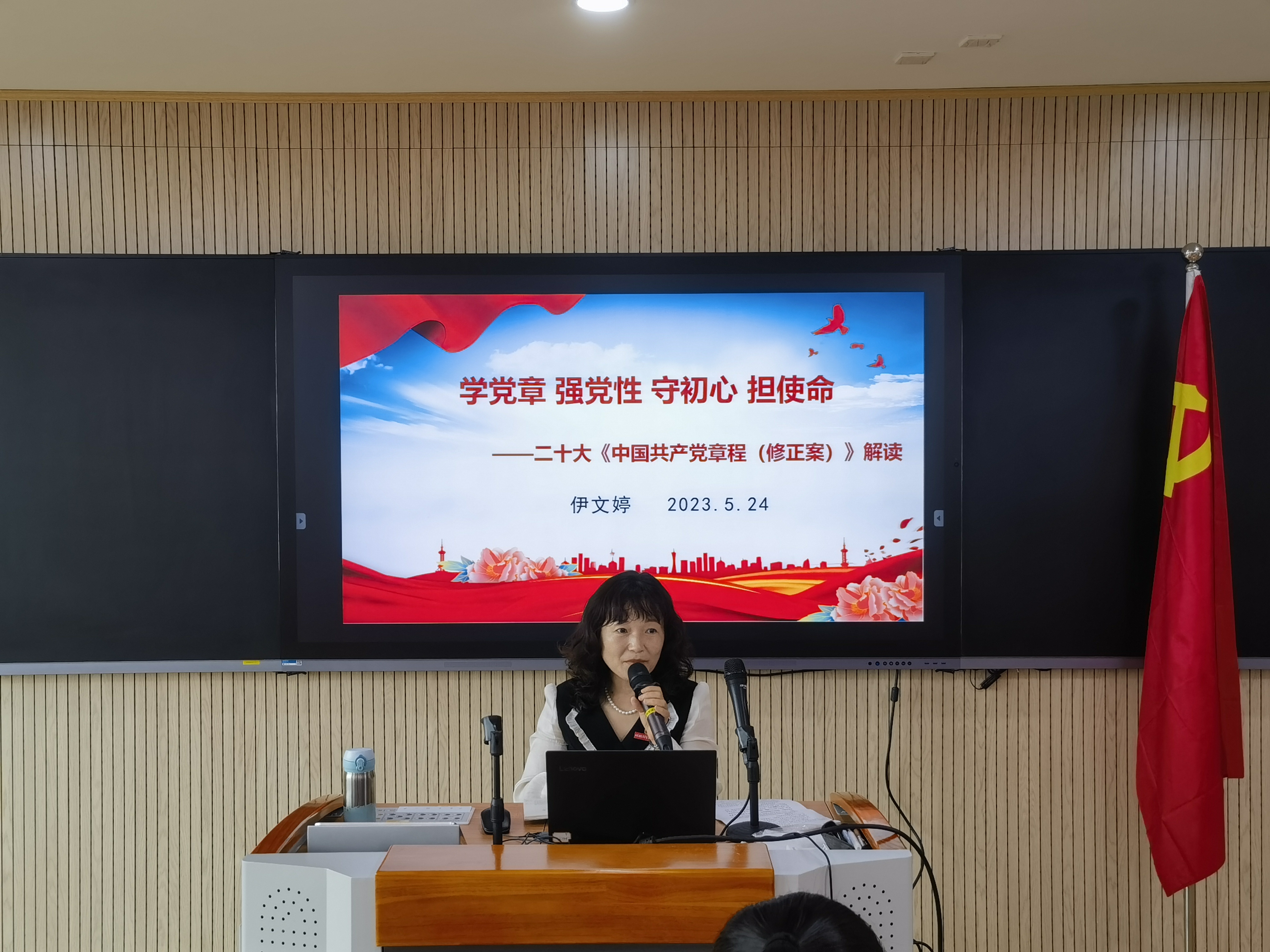 会上,伊文婷院长全面深入地解读了党章的概述,回顾了党章的历次制定及修正情况,重点从"完善党的指导思想、提炼党的成就经验、调整党的目标任务、充实党建总体要求、明确党的领导原则、提升党建实践要求"六个方面阐述了二十大对党章的修改内容,并对党员干部如何学党章、如何进一步深刻领会党章的内涵和精神实质、如何贯彻执行党章进行深入的辅导。伊文婷教授授课深入浅出、条理清晰,为全体党员干部深刻领会二十大党章修正案的重大意义与重要内容、更好地学习党章、遵守党章、贯彻党章、维护党章提供了指导。