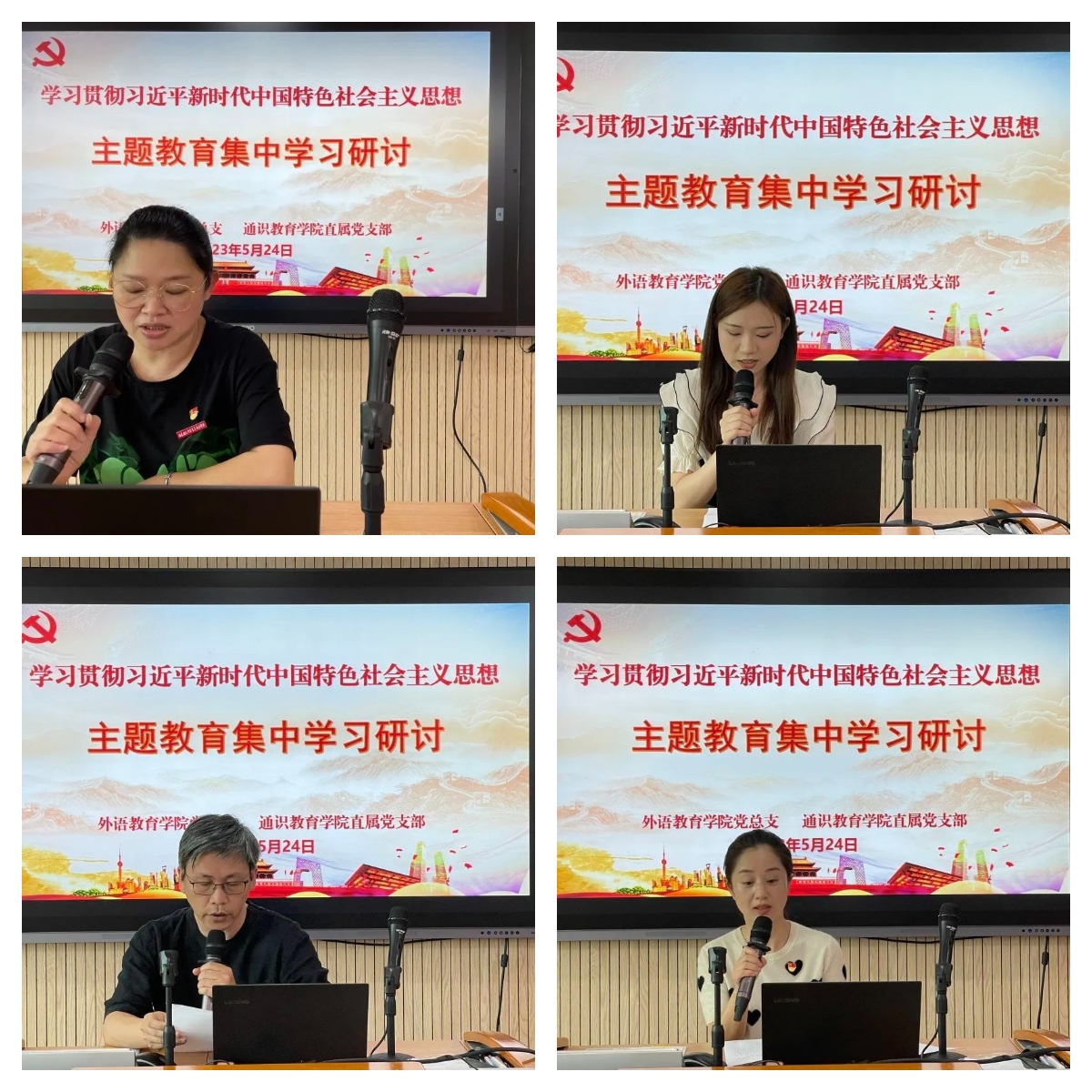 5月24日下午,外语教育学院党总支和通识教育学院直属党支部在金山校区智慧教室联合开展学习贯彻习近平新时代中国特色社会主义思想主题教育集中学习研讨会,并邀请马克思主义学院院长伊文婷教授作题为《学党章 强党性 守初心 担使命——二十大<中国共产党章程(修正案)>》的专题讲座,学习会由外语教育学院党总支林祥昊书记主持。