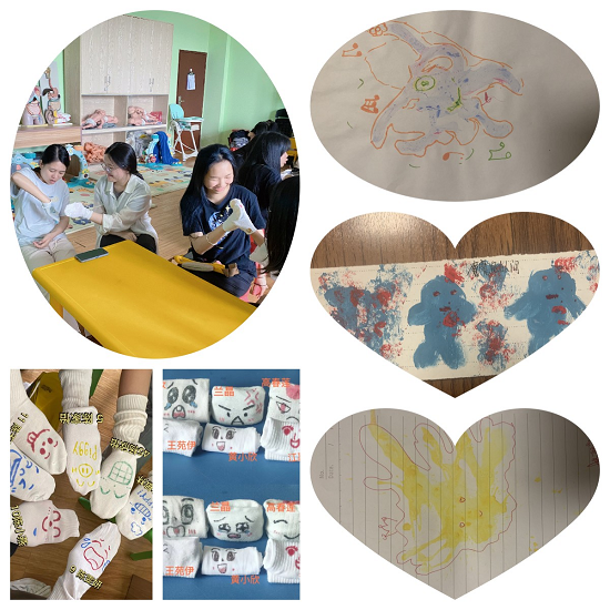 在《婴幼儿游戏》课程中,学生们用废旧袜子制作手偶,促进婴幼儿语言、情绪与社会性发展。在制作过程中,老师帮助学生克服完美主义思想,不敢动笔的心理,培养学生利用废旧物品简快制作适合0-3岁婴幼儿玩教具能力,体验制作玩具的乐趣。学生还创造性的制作了变脸的袜子手偶,体现婴幼儿情绪易改变的特点。在《婴幼儿情绪与社会性发展与教育》课程中,教师们采用"吹画游戏",帮助学生们转化恐惧情绪,达到情绪调节的效果。此法同样适合于0-3婴幼儿情绪调节。