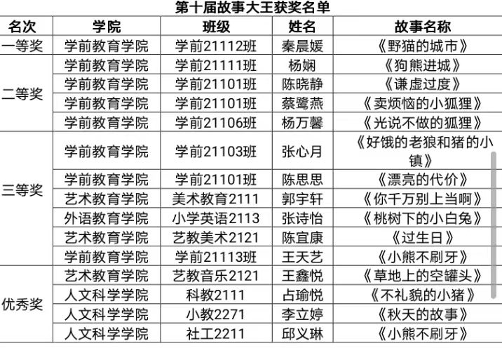 本届大赛以"童心逐梦向未来"为主题,围绕习近平新时代主题教育要求,根植中国精神,为广大学生搭建校园文化舞台,促进书香校园建设,营造良好的校园语言艺术氛围。来自5个学院的15位选手通过层层选拔进入总决赛,他们绘声绘色的讲述、惟妙惟肖的表演,为观众带来一场视听盛宴。经过激烈比拼,来自学前教育学院2021级的秦晨媛摘得桂冠,展现了师范生语言基本素养。故事大王擂台赛目前已成为我校的一项经典校园文化品牌,这一品牌带来的效应大大提升了教师口语课程教学的专业品质。