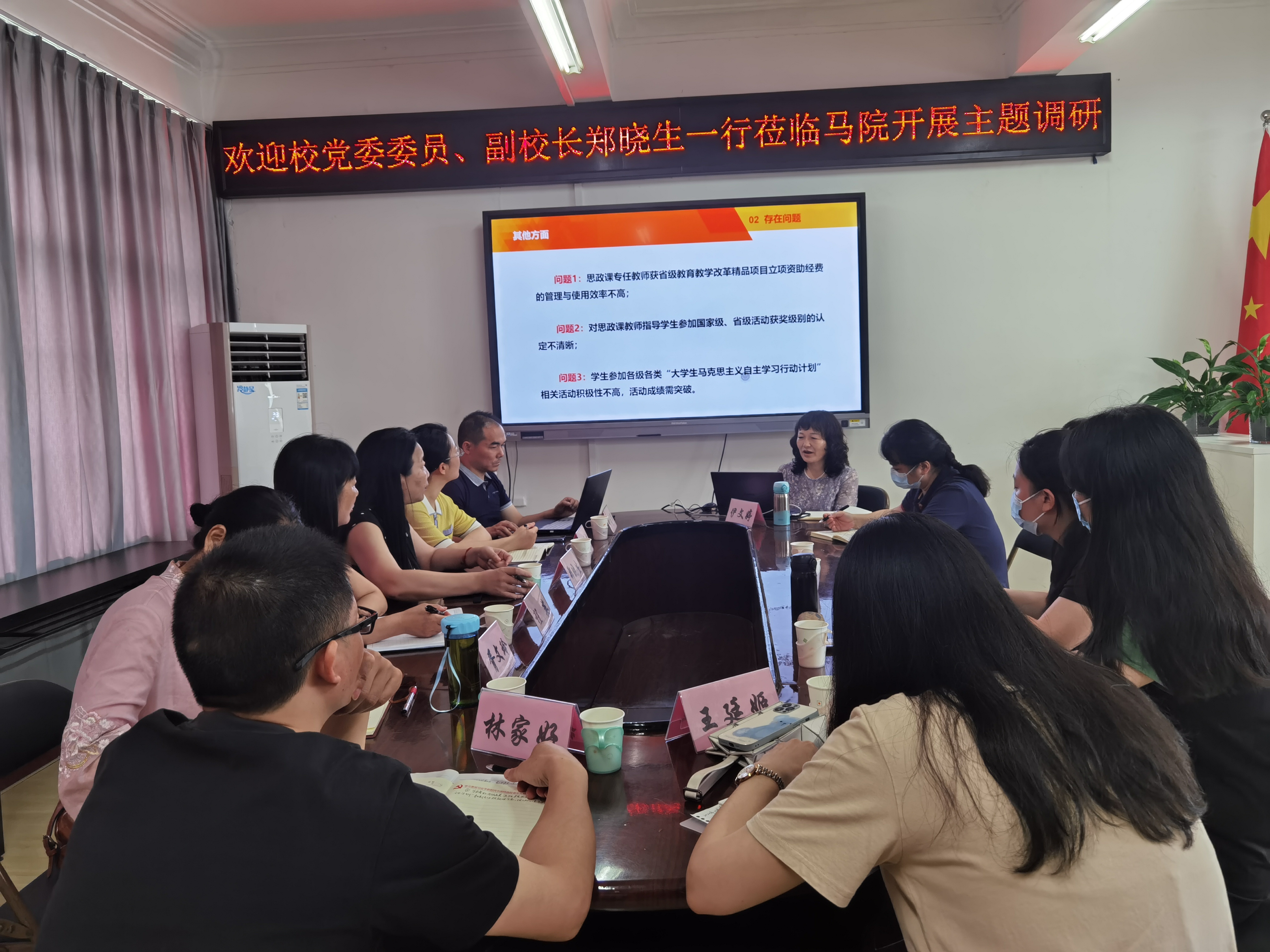 2023年6月7日上午,校党委委员、副校长郑晓生教授一行莅临马克思主义学院开展专题调研会。教务处、科研处、质评中心和图书馆等相关部门负责人陪同调研。会议由马克思主义学院院长伊文婷主持。