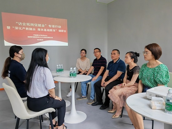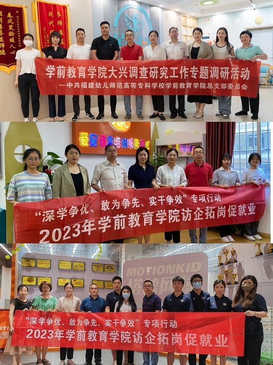 进一步学习贯彻习近平新时代中国特色社会主义思想主题教育调研活动,有效落实党中央、国务院关于高校毕业生就业工作的决策部署,2023年5月31日至6月1日,在学校教务处叶圣军副处长带领下,学前教育学院陈孟增副书记、肖英娥副院长及学院专业教师王先达教授、王笑梅老师、焦静老师等人分赴福建星辰蔚来教育科技有限公司、台江区爱星语言培训服务中心、福建爱动塔普体育文化发展有限公司开展"访企拓岗促就业"专项行动。