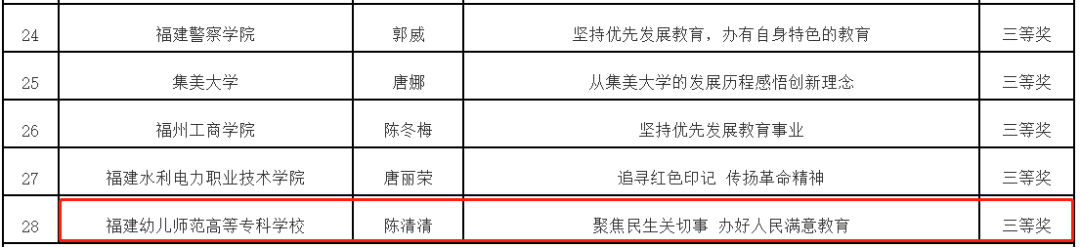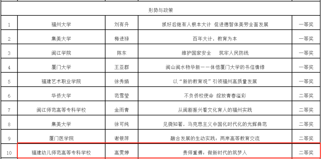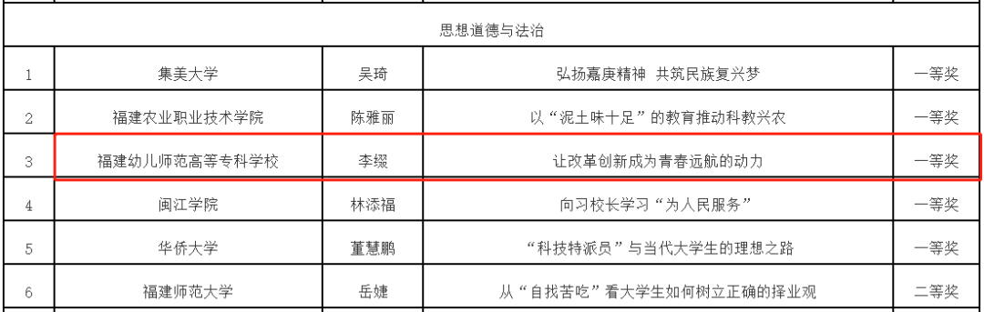 近日,由中共福建省委教育工委、福建省教育厅主办的福建省高校"习近平与教育故事"思政课"金课"遴选结果公布,我院选送的三位老师作品均获奖,揽括了一、二、三等奖!其中,李缀老师申报的《让改革创新成为青春远航的动力》获得"思想道德与法治"课程组一等奖、高雯婷老师申报的《贵师重傅 做新时代筑梦人》获得"形势与政策"课程组二等奖,陈清清老师申报的《聚焦民生关切事 办好人民满意教育》获得"毛泽东思想和中国特色社会主义理论体系概论"课程组三等奖。